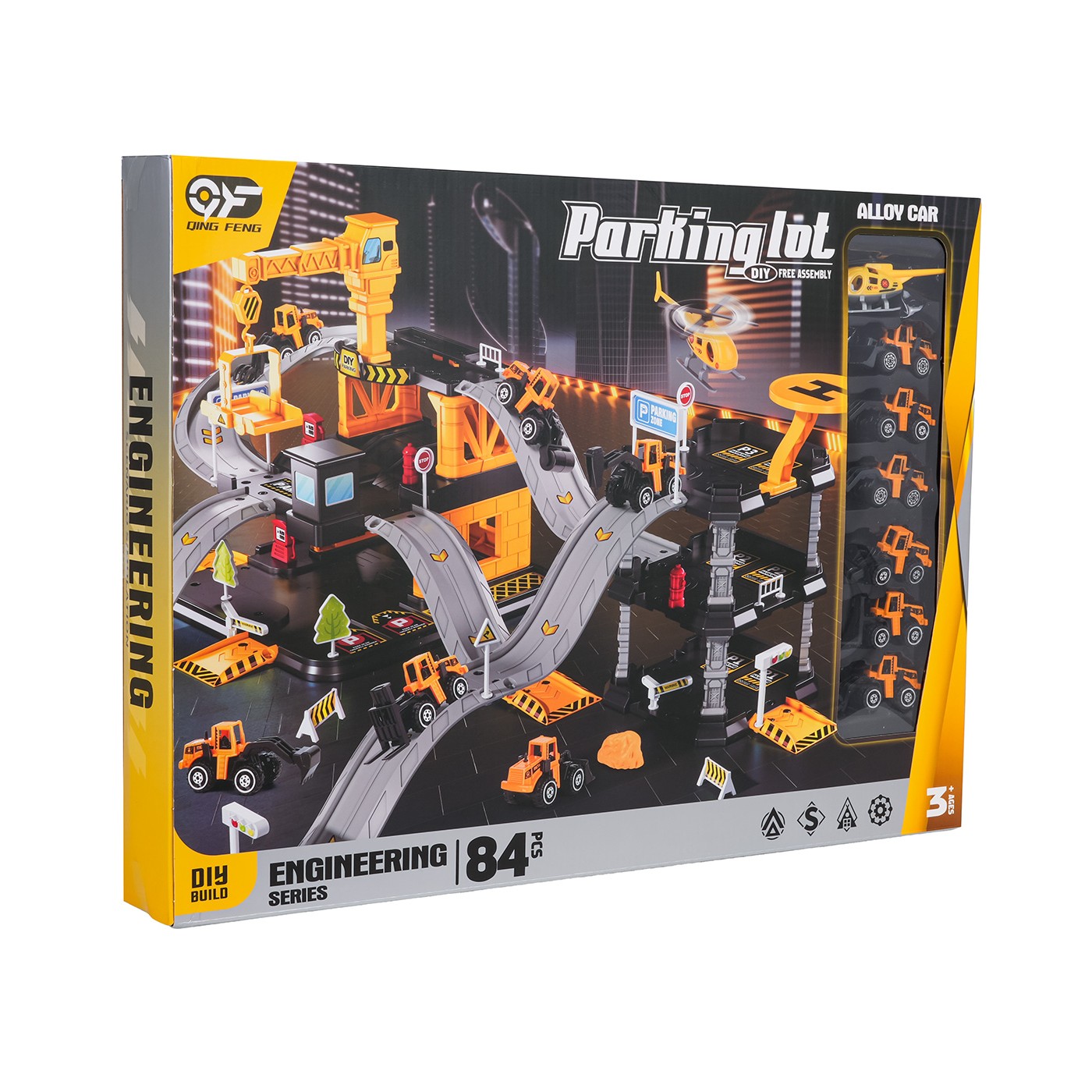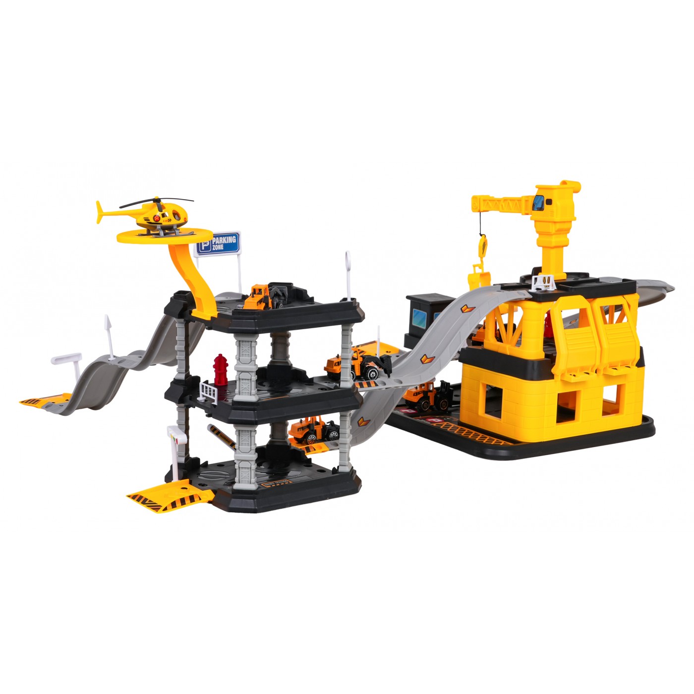 A large multi-story parking lot with a construction site and construction vehicles for children aged three and up. The set consists of 84 pieces for self-assembly. Each piece is made with attention to detail from the highest quality, child-safe materials. Once assembled, the parking lot consists of two sections connected by a slide. The first section is a three-story parking lot for construction vehicles with a helicopter landing area. The second section is a three-story construction site with a movable crane, a gas station, and numerous slides for construction vehicles. The set includes six construction vehicles and a helicopter. This is the perfect set for hours of fun; your little one can take on the role of a construction manager and manage the work.