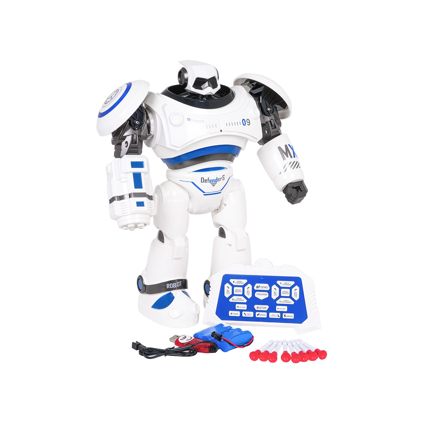 The MX09 blue, remote-controlled, multi-functional robot is suitable for children aged six and up. The robot is made of high-quality plastic that withstands heavy use. It features glowing eyes, walks forward and backward, turns left and right, slides, moves its arms, plays melodies, talks, and in DEMO mode, demonstrates all its capabilities. The robot's movements can also be programmed. There's also a multi-level volume control. The robot is powered by a 4.8V 700mAh Ni-Cd battery and charged via a USB cable. The remote control is powered by 2 x 1.5V AA batteries (not included).