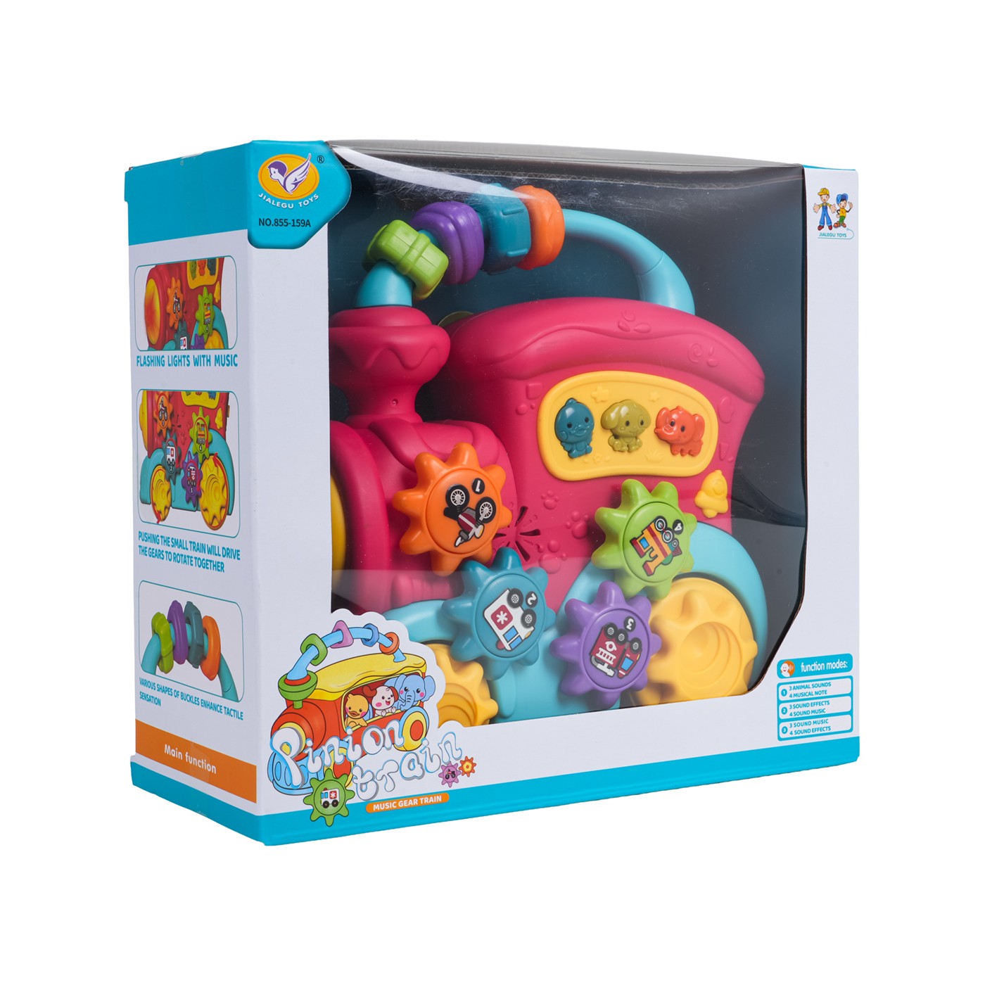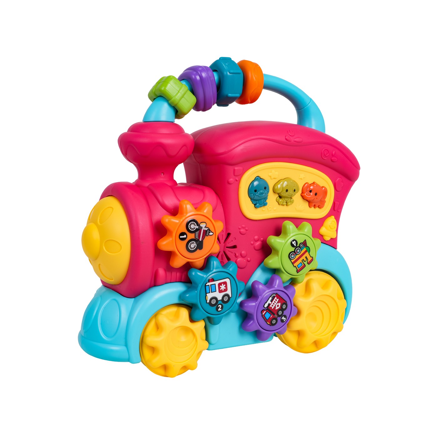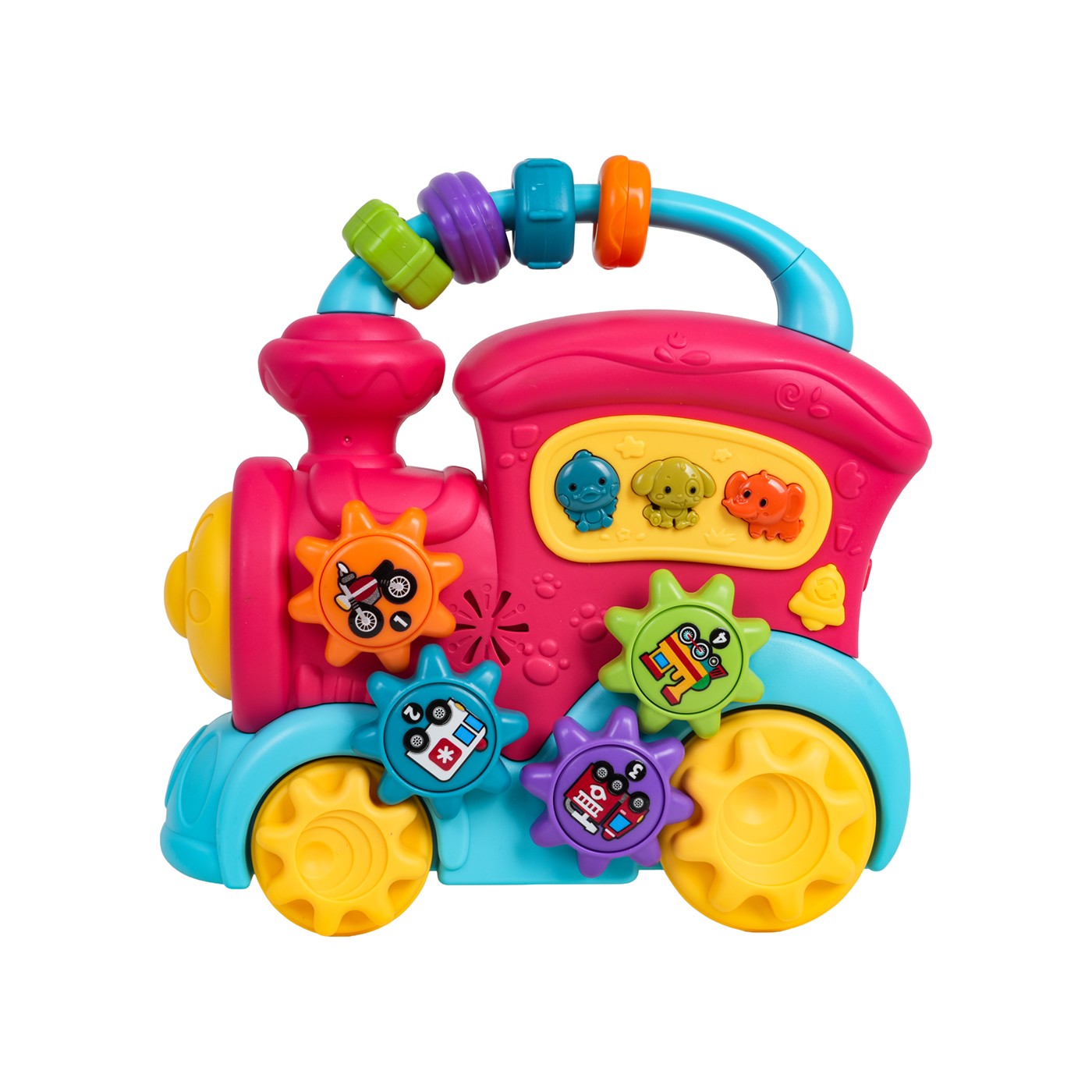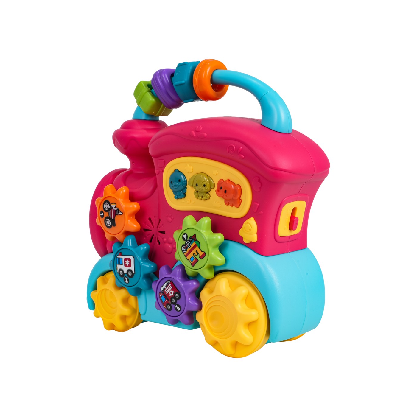 An interactive toy train with sound and light for children aged twelve months and up. Made of high-quality plastic in vibrant colors, it's safe for babies and has no sharp edges. The toy offers a variety of attractions and stimulates children on various levels. The rear of the train features a two-stage volume control, a rooftop slider with sensory beads, and the sides of the train feature gears with vehicle designs and animal buttons. As the train moves across the ground, the gears on the toy activate, spinning and making a rattling sound. Pressing a gear activates a musical note. The animal buttons activate duck, dog, or elephant sounds, as well as various bells or melodies, depending on the mode selected (bell button). The toy train has an illuminated headlight and is powered by 3 x AA 1.5V batteries (batteries not included). Features: - for children from twelve months of age, - a toy made of the best quality materials in vivid colors, - sound effects: animal sounds (elephant, dog, duck), cheerful melodies, gear rotation sounds, musical notes sounds, - lighting effects: illuminated spotlight, - volume control, - gear shifter with gears. |