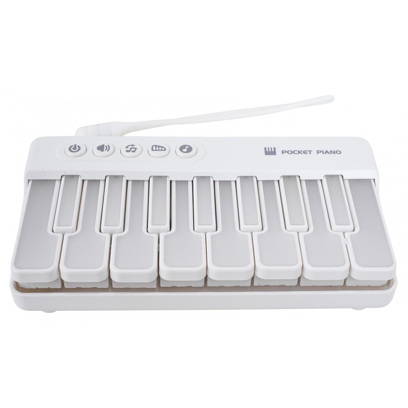 A portable white piano for children aged three and up. The piano will be helpful in learning to play, thanks to its illuminated keys that indicate how to play. Its lightweight and compact design makes it easy to take anywhere. The toy is powered by 3 x 1.5V AAA batteries (not included).