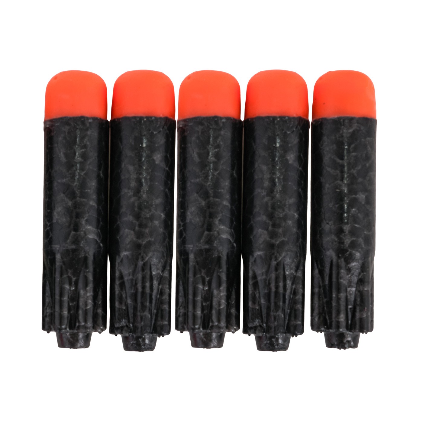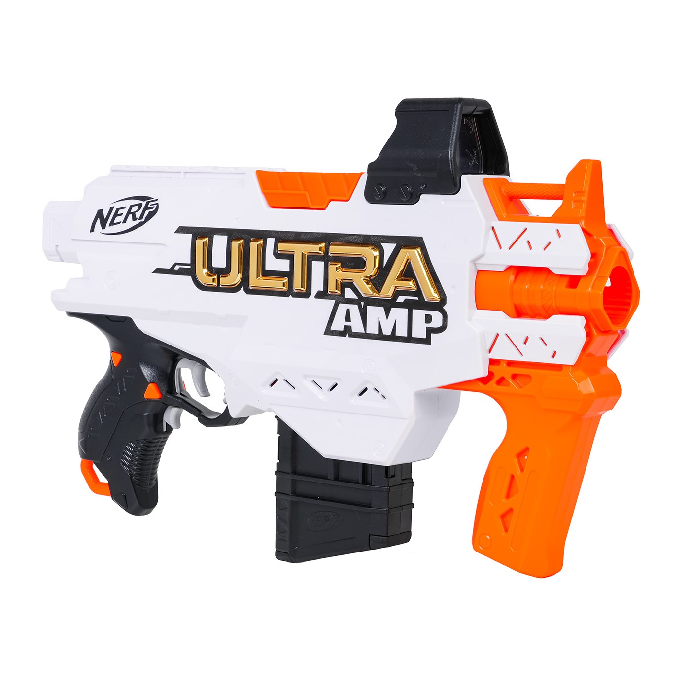 A semi-automatic NERF Ultra AMP dart gun for children aged eight and up. The gun is powered by 6 x AA 1.5V batteries (not included). It has a magazine that holds 6 foam darts and a sight. Load the magazine with darts, hold the acceleration button, and squeeze the trigger. The darts can fly up to 25 meters. They feature a unique, innovative shape for improved accuracy and range. They are tipped with rubber for added safety. The gun has a special port for removing jammed darts.