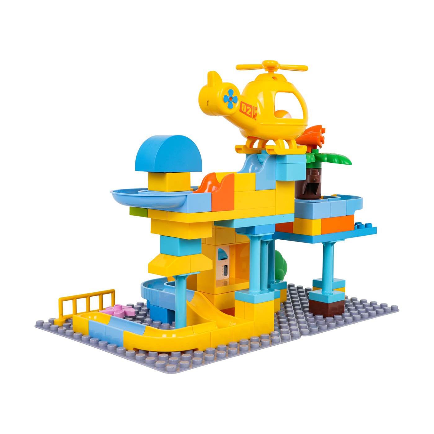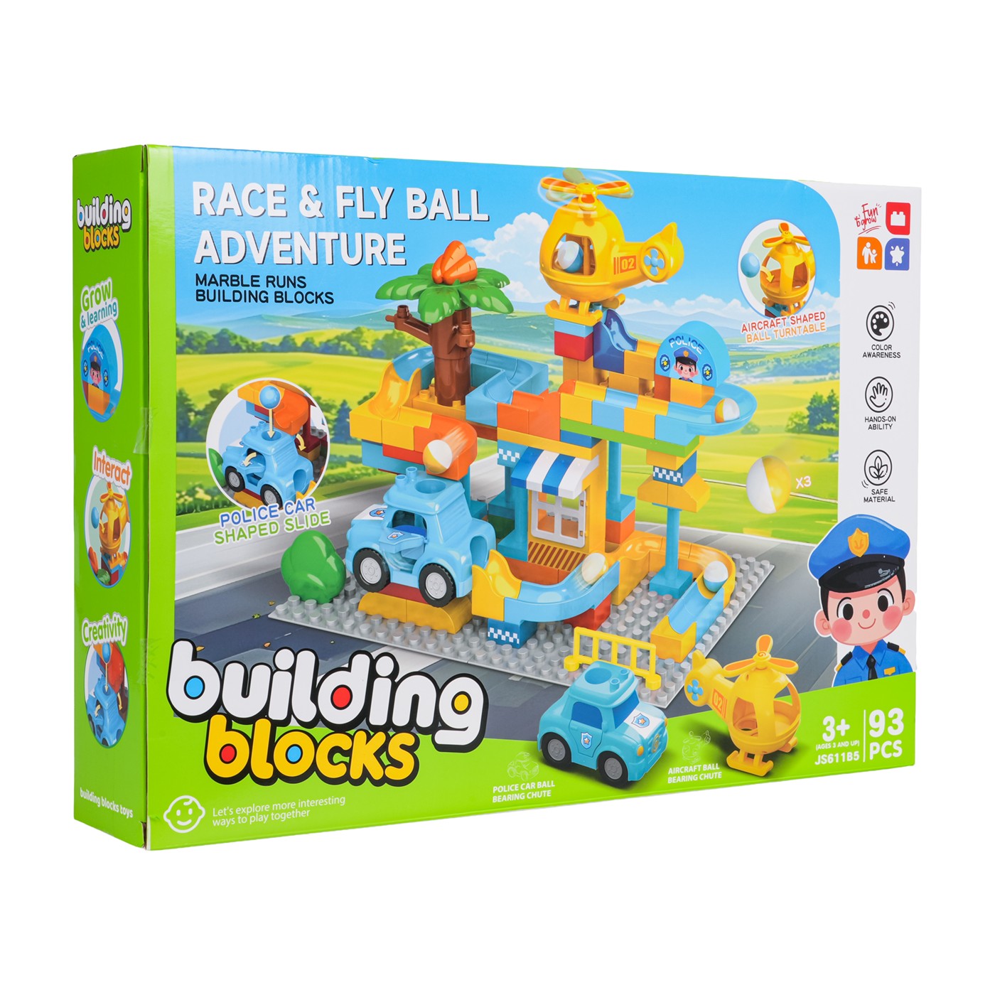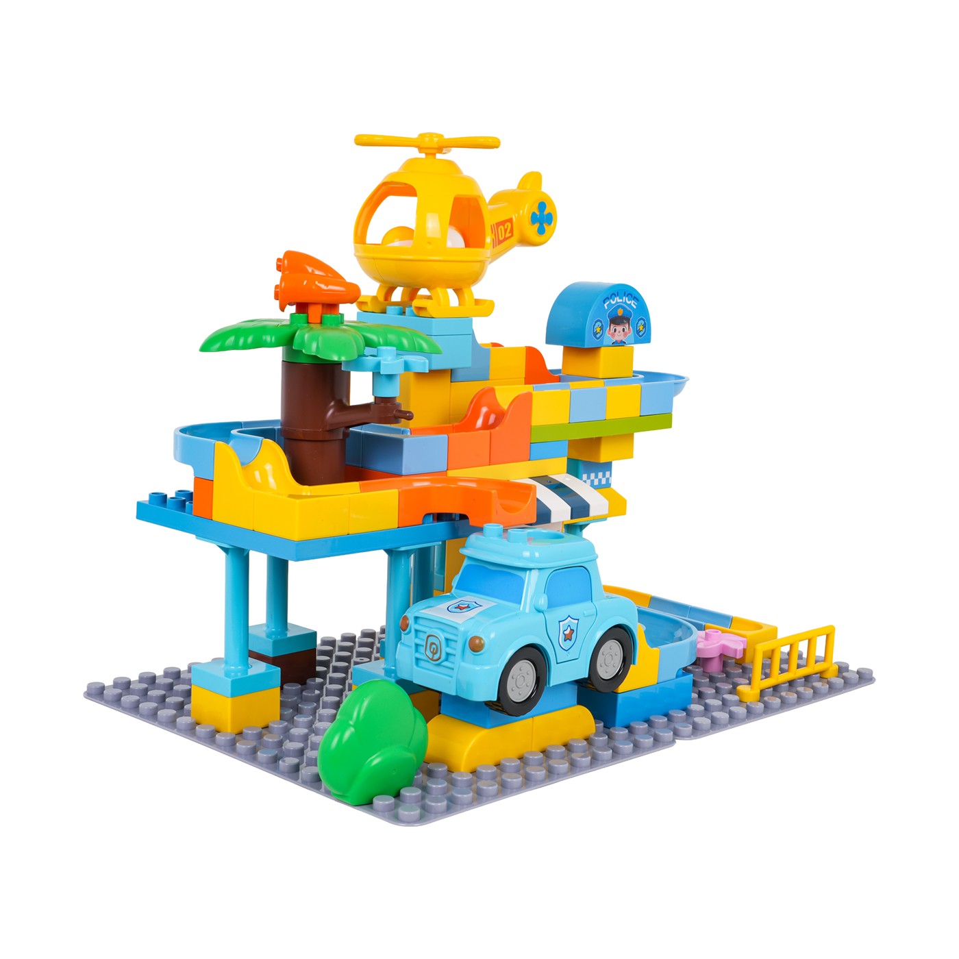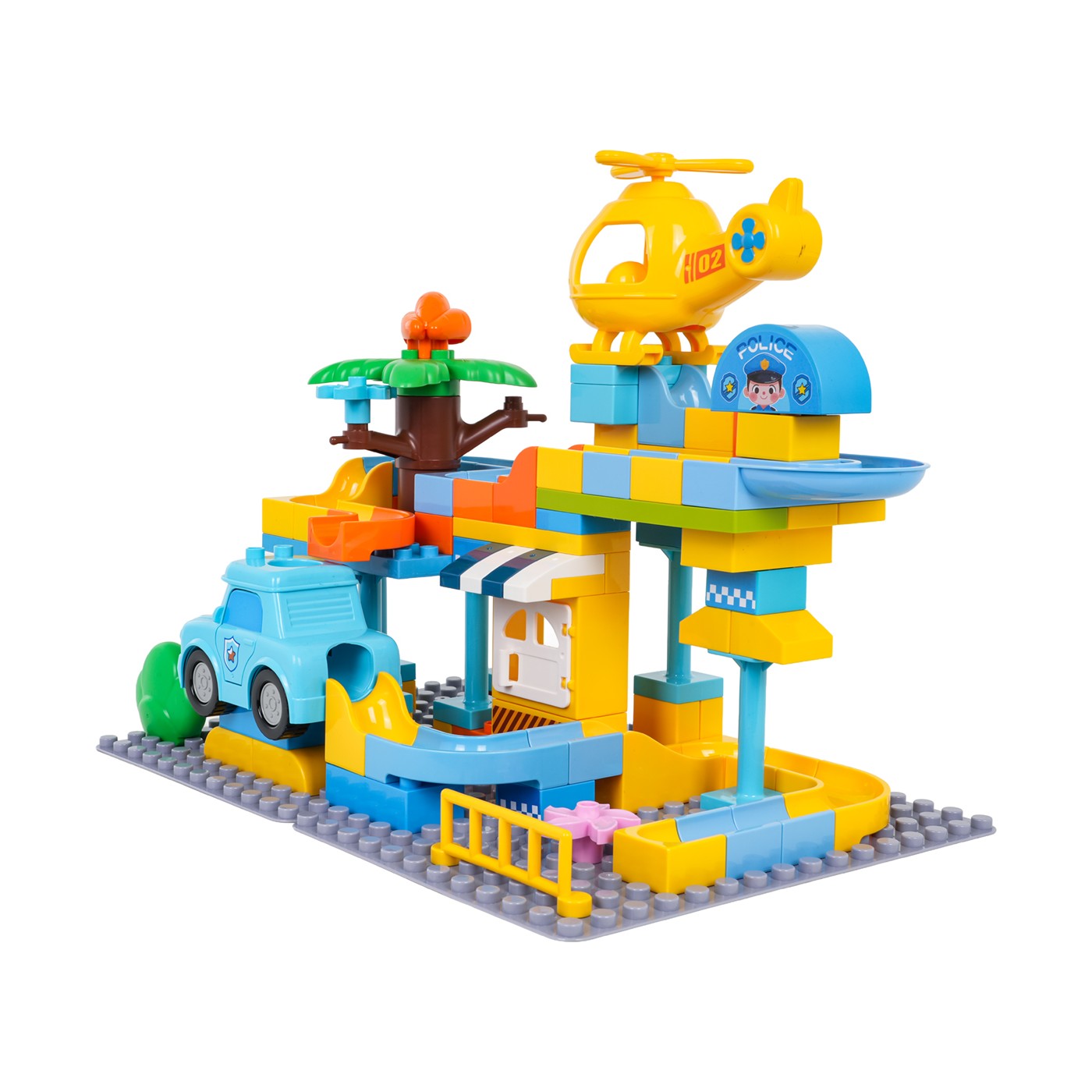 This set of large, colorful blocks allows children aged three and up to build a police station. The blocks easily connect to form stable structures. The rich colors encourage creative play. The set also includes a slide, a toy car, a helicopter, and three balls. The helicopter and police car have a hole for the ball to pass through. This set is perfect for creative play.