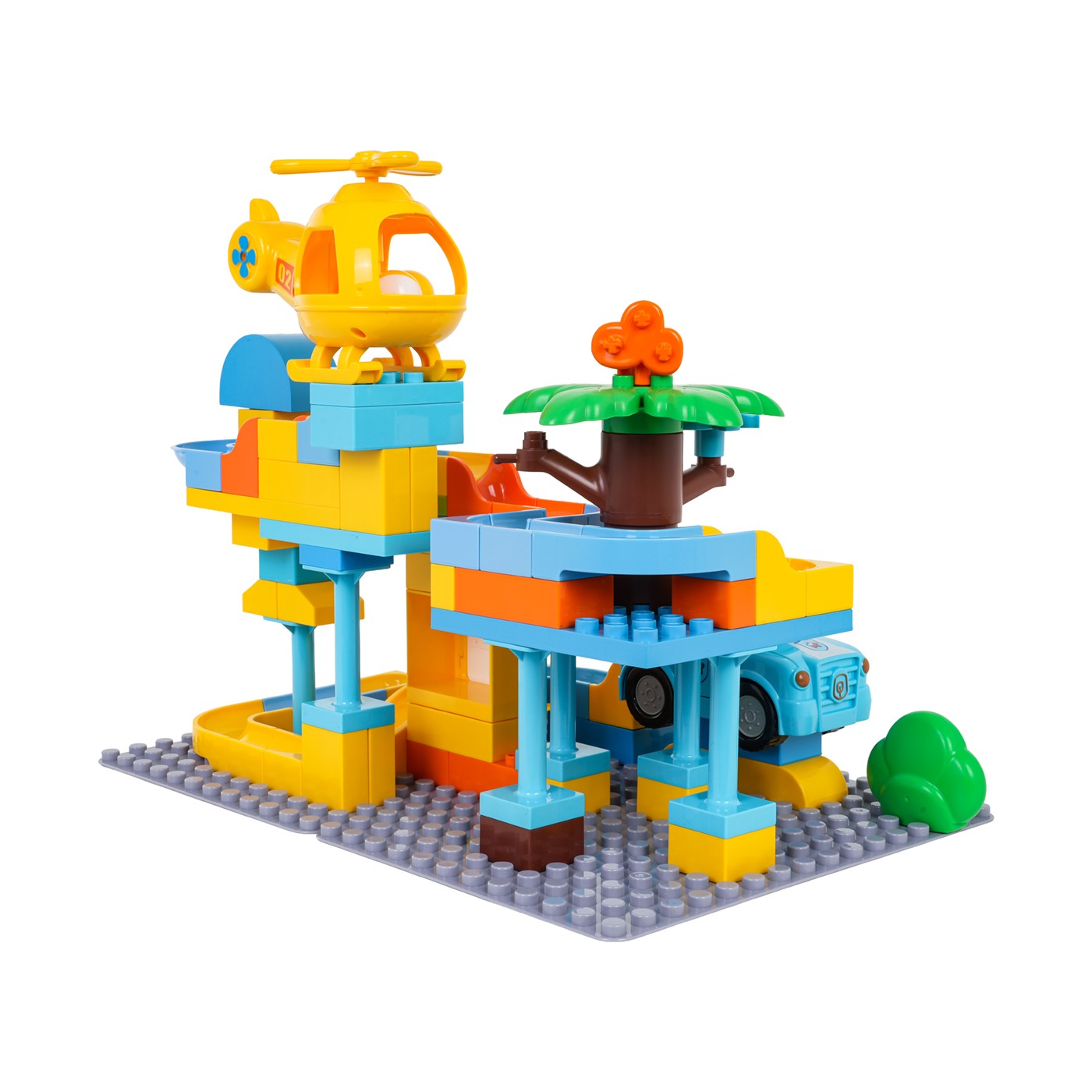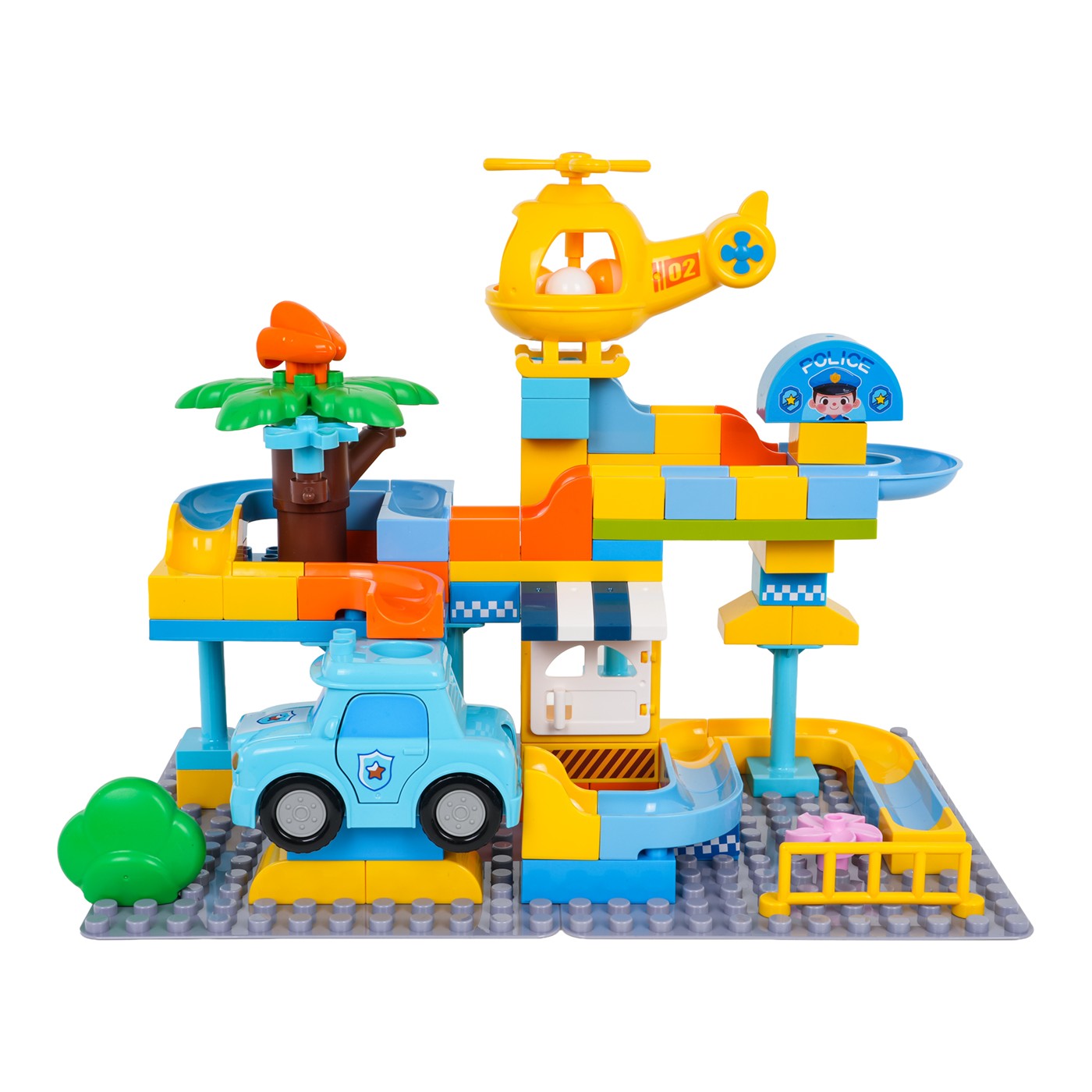 Features: - for children from three years of age, - made of the best quality materials, - easy connection of elements and stable construction, - the richness of colors stimulates the child's senses, - the police car and helicopter have holes through which the ball can fly, - the perfect set for creative play. |