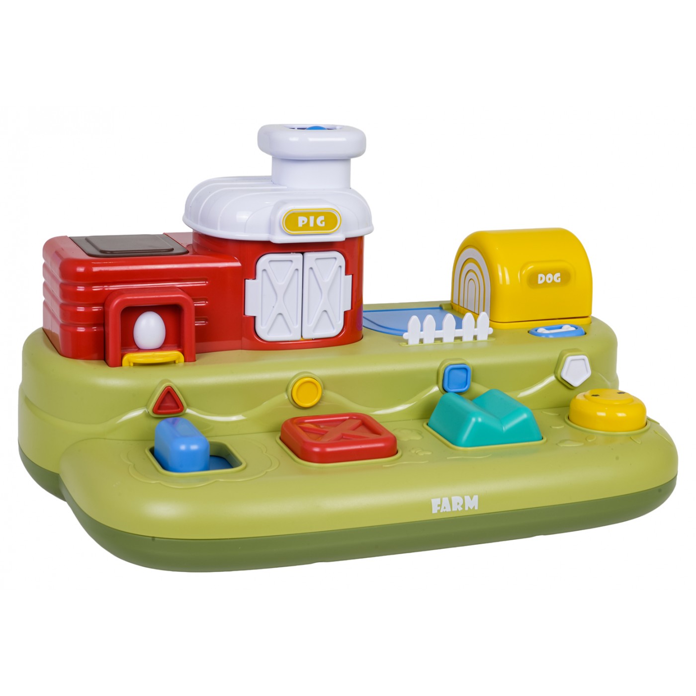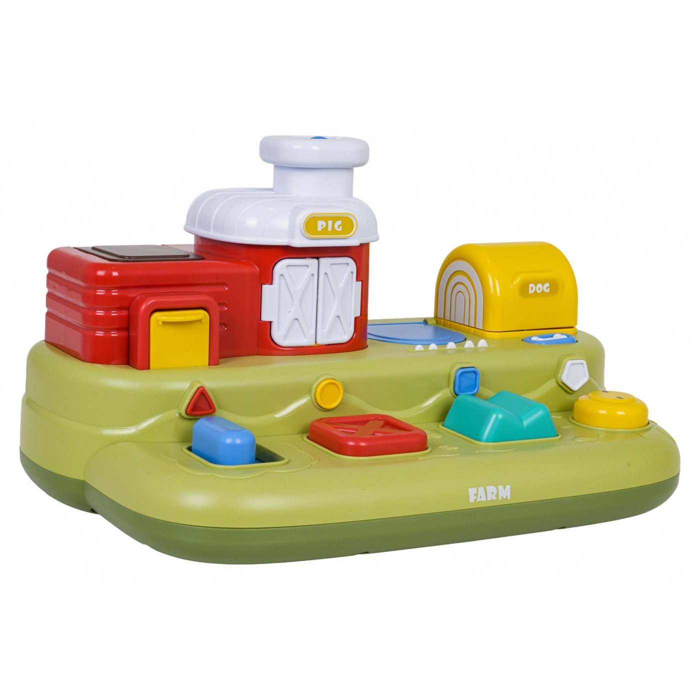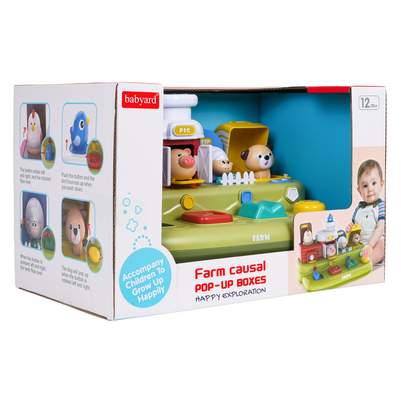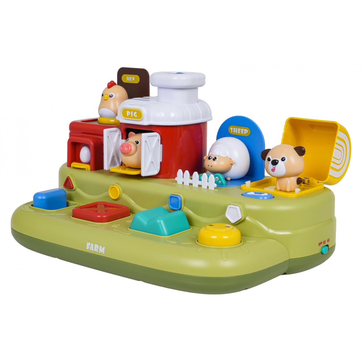 A colorful toy with pop-up animals and sound effects for children aged twelve months and up. Made of the highest quality, safe materials in vibrant colors, the base features boxes and buttons in various shapes. Sliding the blue button to the right reveals a chicken, pressing the red button opens a door, and a pig pops out. Pressing the green button reveals a sheep, and turning the yellow button reveals a dog. Above the buttons are buttons that activate various sounds, melodies, and animal sounds. The toy is powered by 3 x AA 1.5V batteries (batteries not included).