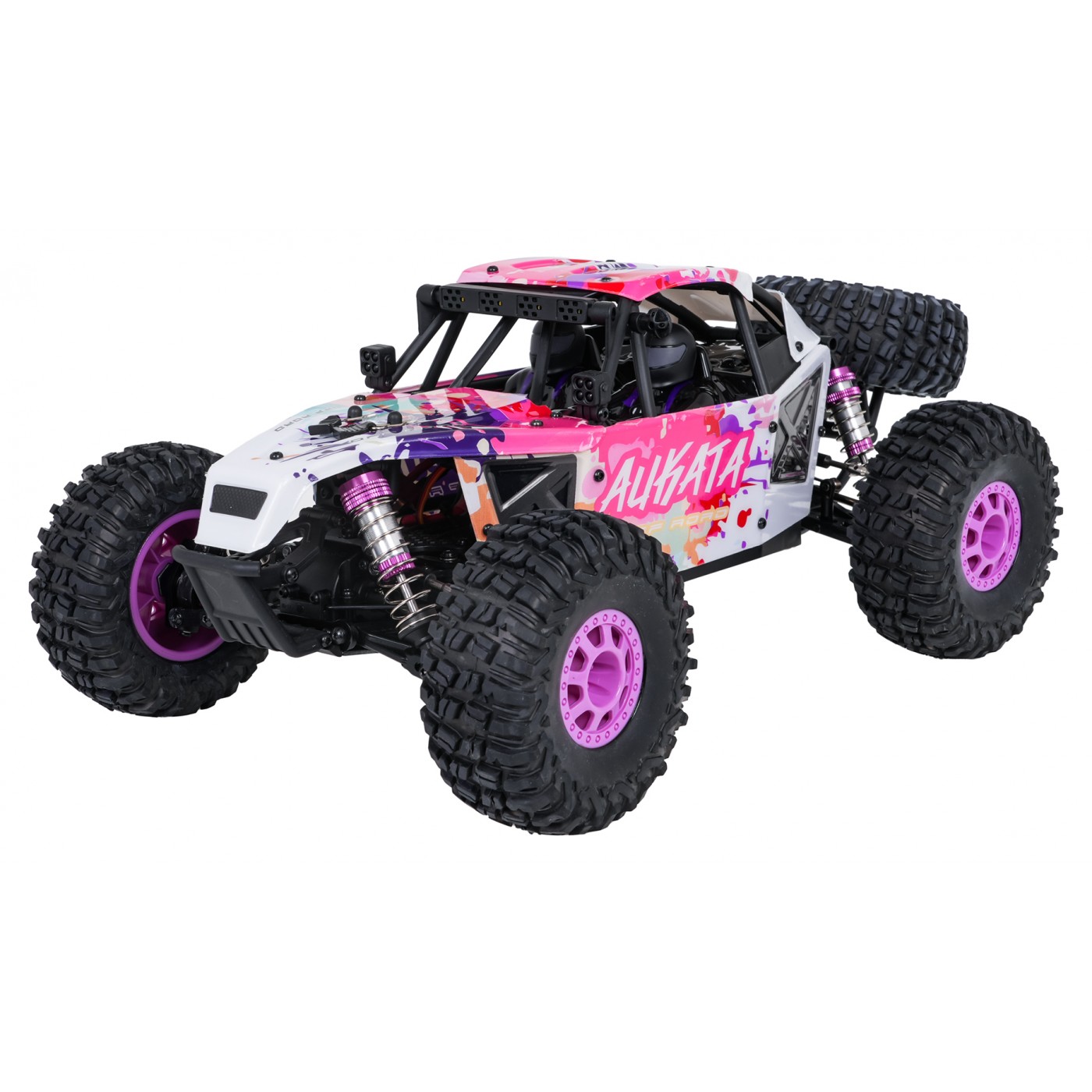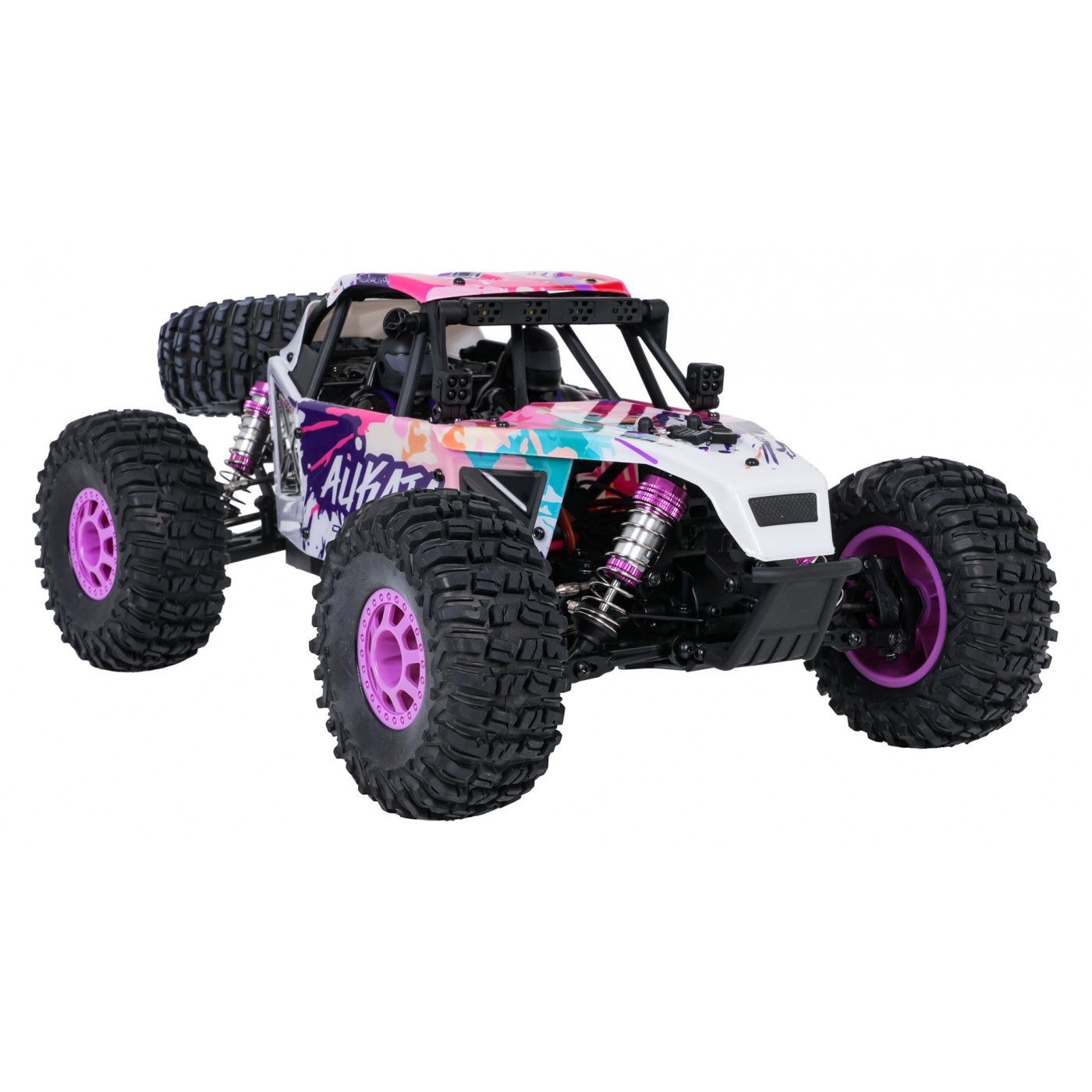The mega-fast Alikata crawler, made in 1:12 scale, is suitable for children aged fourteen and up and adults. Built from the highest quality materials, it is resistant to impacts and damage. It features a metal body, a metal chassis, and a modified drivetrain to better withstand impacts. Large rubber anti-slip tires provide good traction. A spare tire is also included. Four-wheel drive and adjustable aluminum shock absorbers provide excellent handling. This incredible off-road vehicle can reach speeds of up to 50 km/h in 3 seconds. The crawler is equipped with a powerful 7.4 V battery (included), and the remote control is powered by 3 x AA 1.5 V batteries (included).