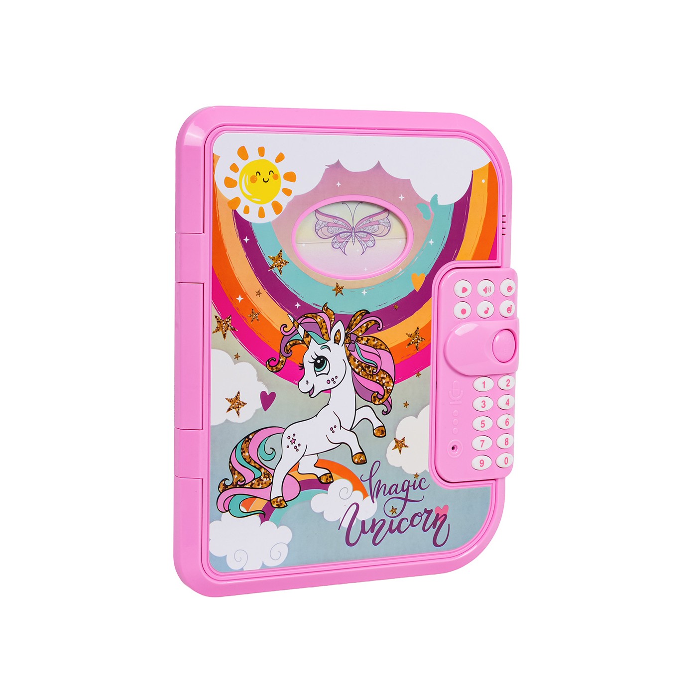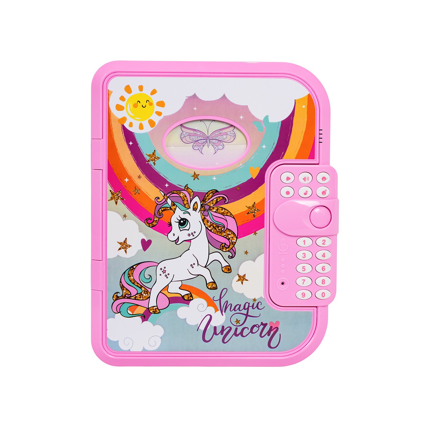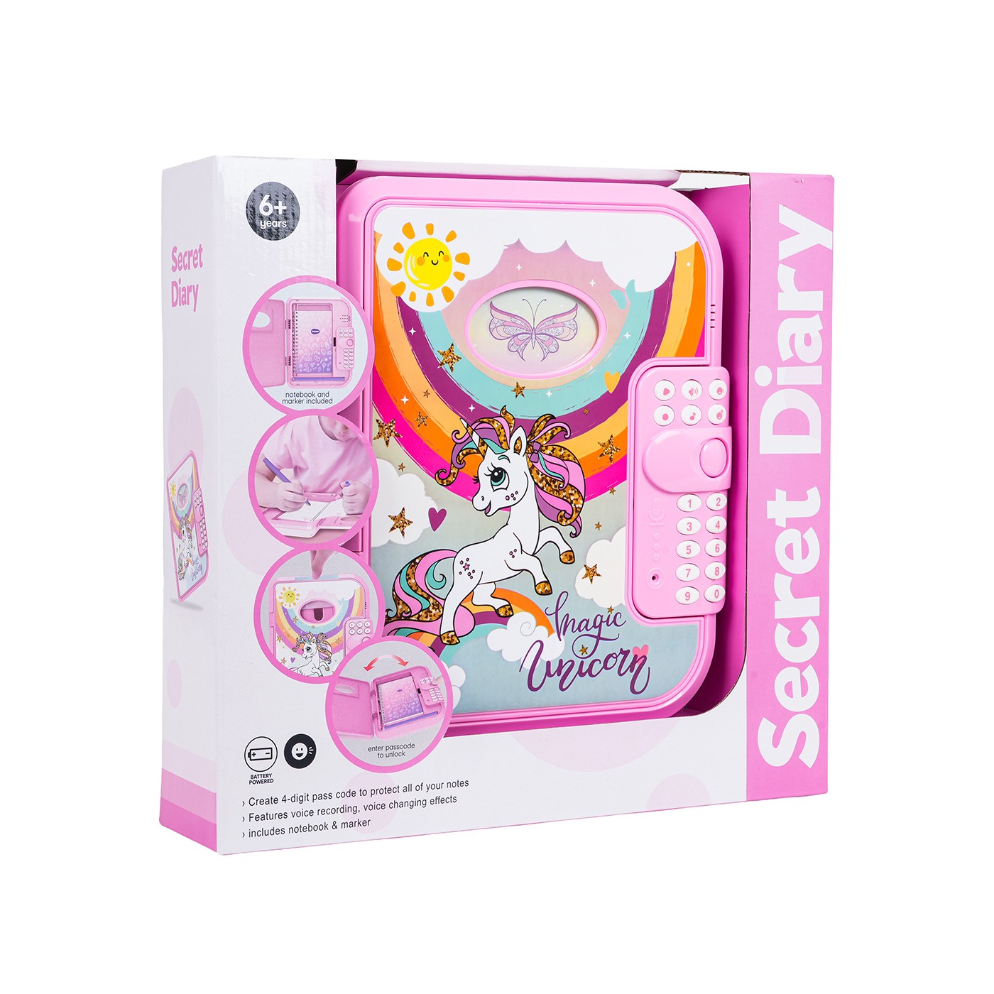 A secret unicorn diary for children aged six and up. Crafted from the highest quality materials with meticulous attention to detail, no one but the person who knows the password will open the diary, so your child's secrets are safe. You can add your photo to the diary's cover, and use the button panel to play voice recordings, play cheerful melodies, change the voice, or play a number-guessing game. The set includes a secret diary with a compartment, a notebook, and a marker. The diary is powered by 3 x AA 1.5V batteries (not included).