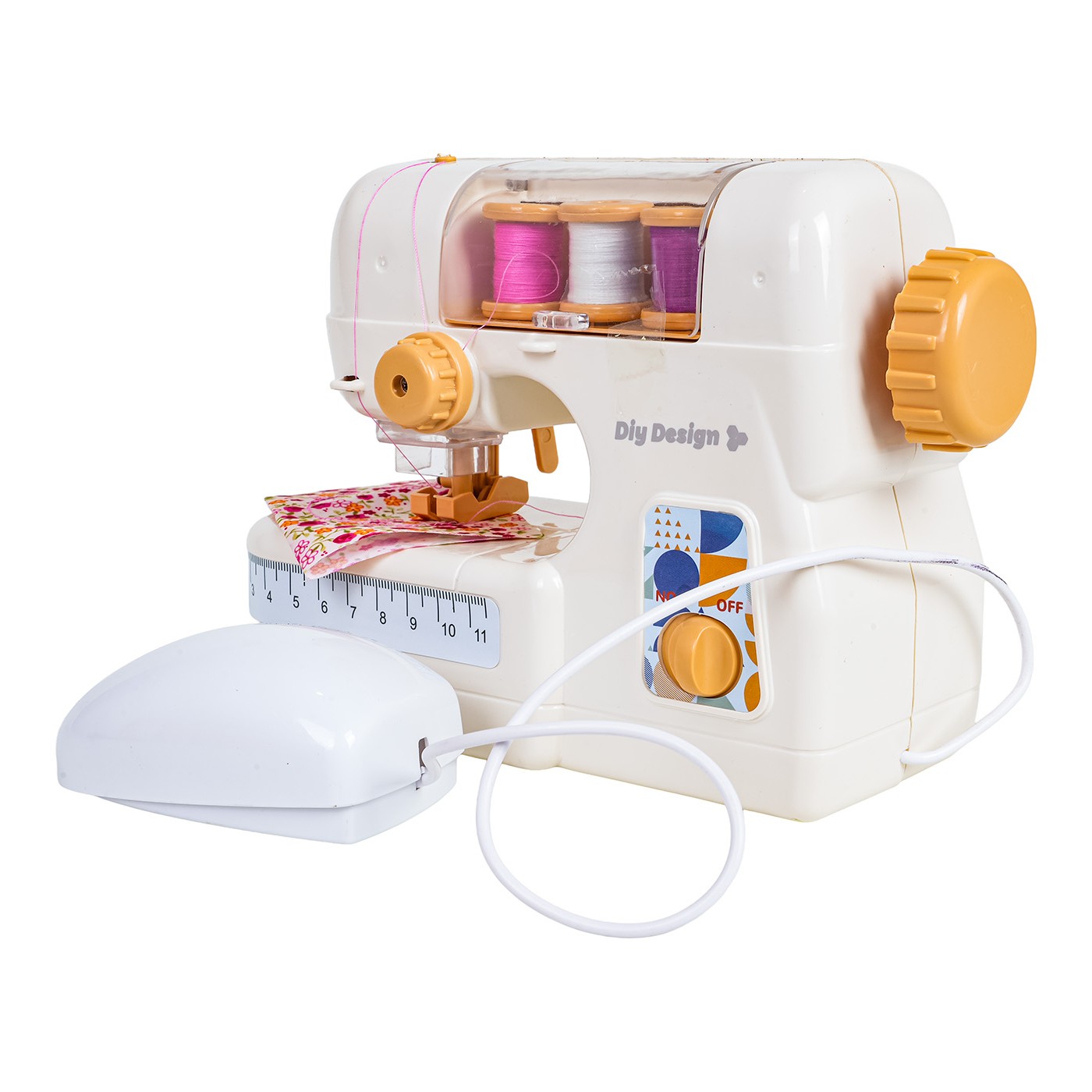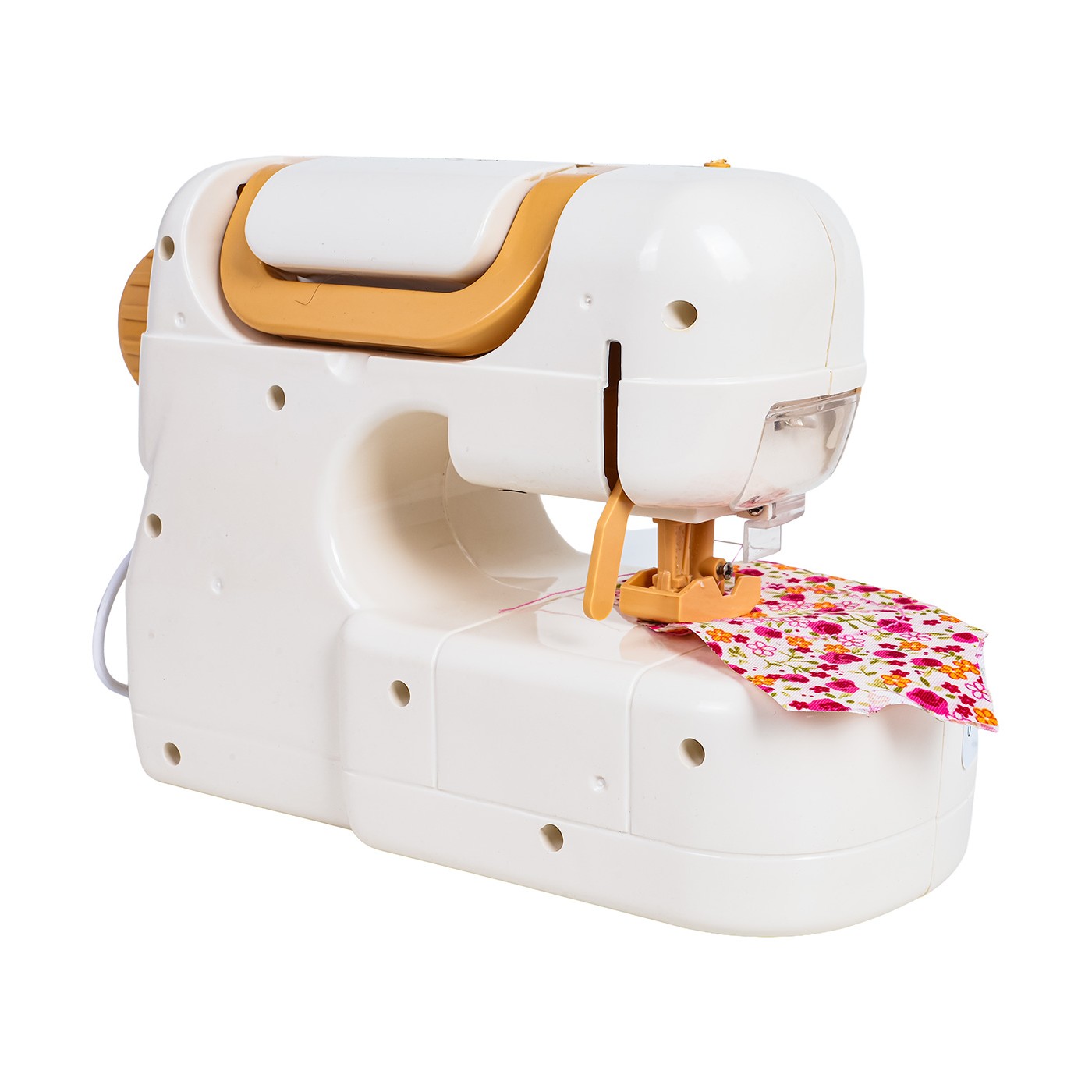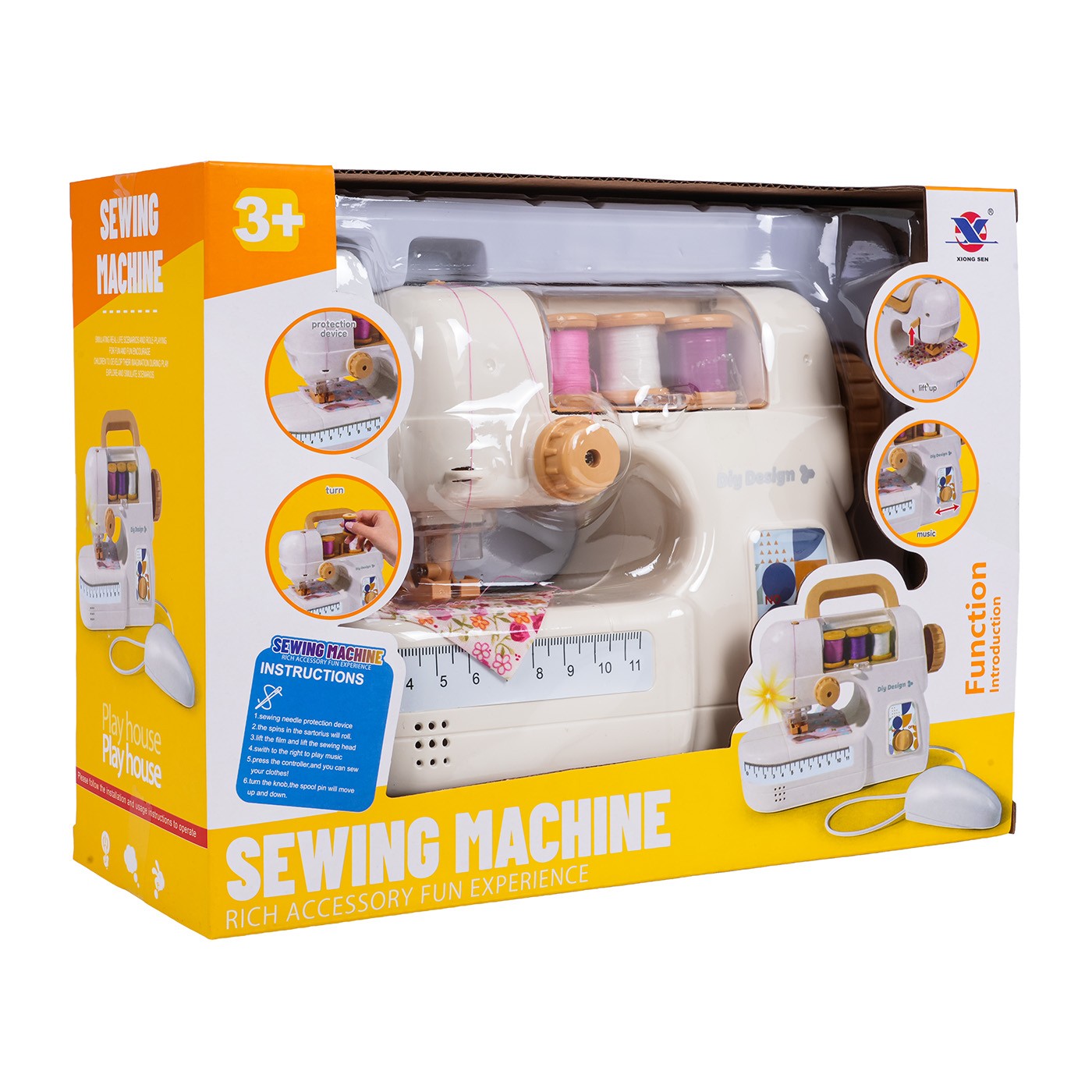 An interactive sewing machine with sound and light effects for children aged three and up. Made of durable materials, this toy is child-safe. The machine has a built-in needle to prevent injury. The toy is equipped with a practical mouse to activate the machine, a needle lifter, and a presser foot lifter. While the machine is in operation, a light illuminates and sewing sounds are heard. The set also includes three spools of thread and a piece of fabric. Playing with the machine supports the development of eye-hand coordination and creativity. The machine is powered by 4 x 1.5V AA batteries (not included).