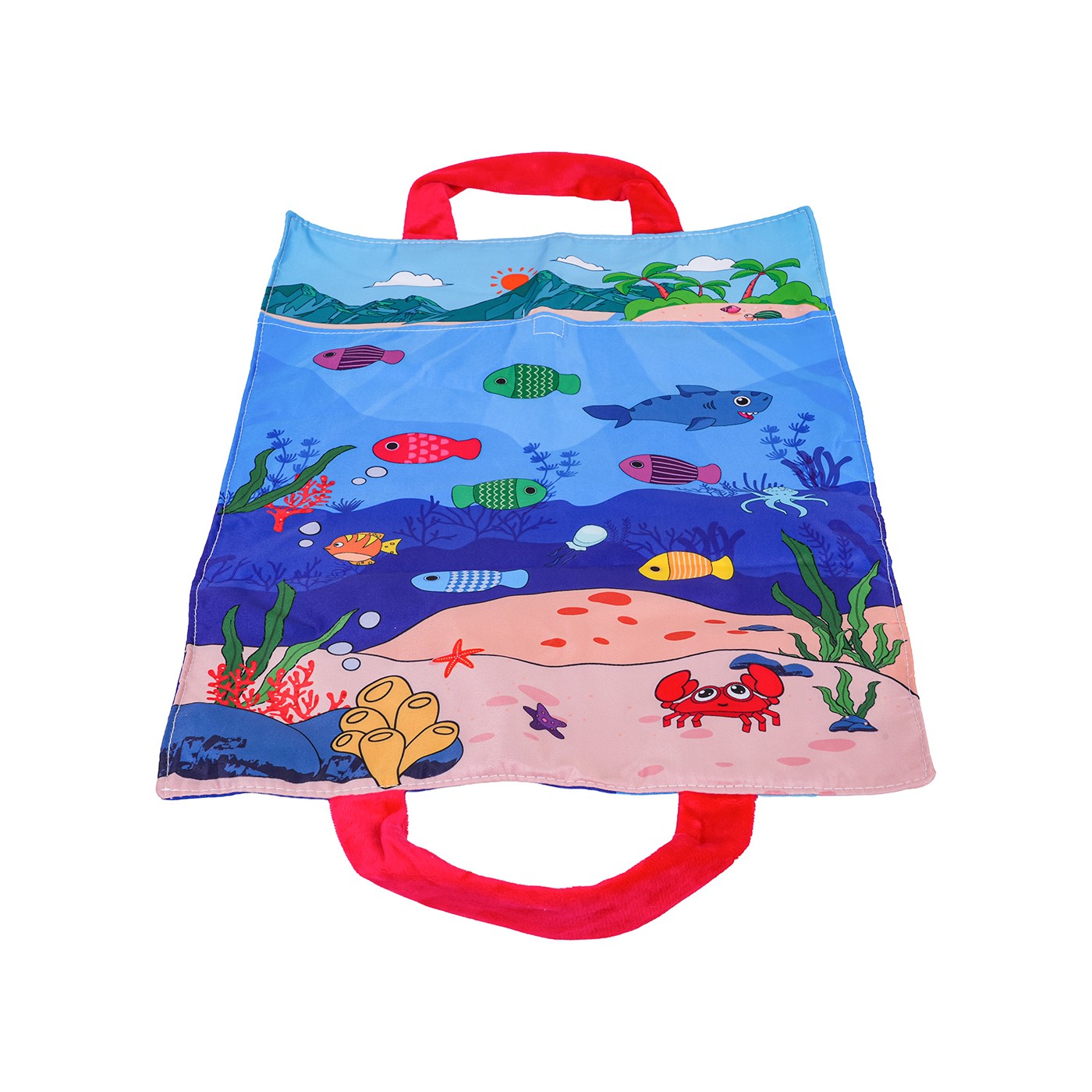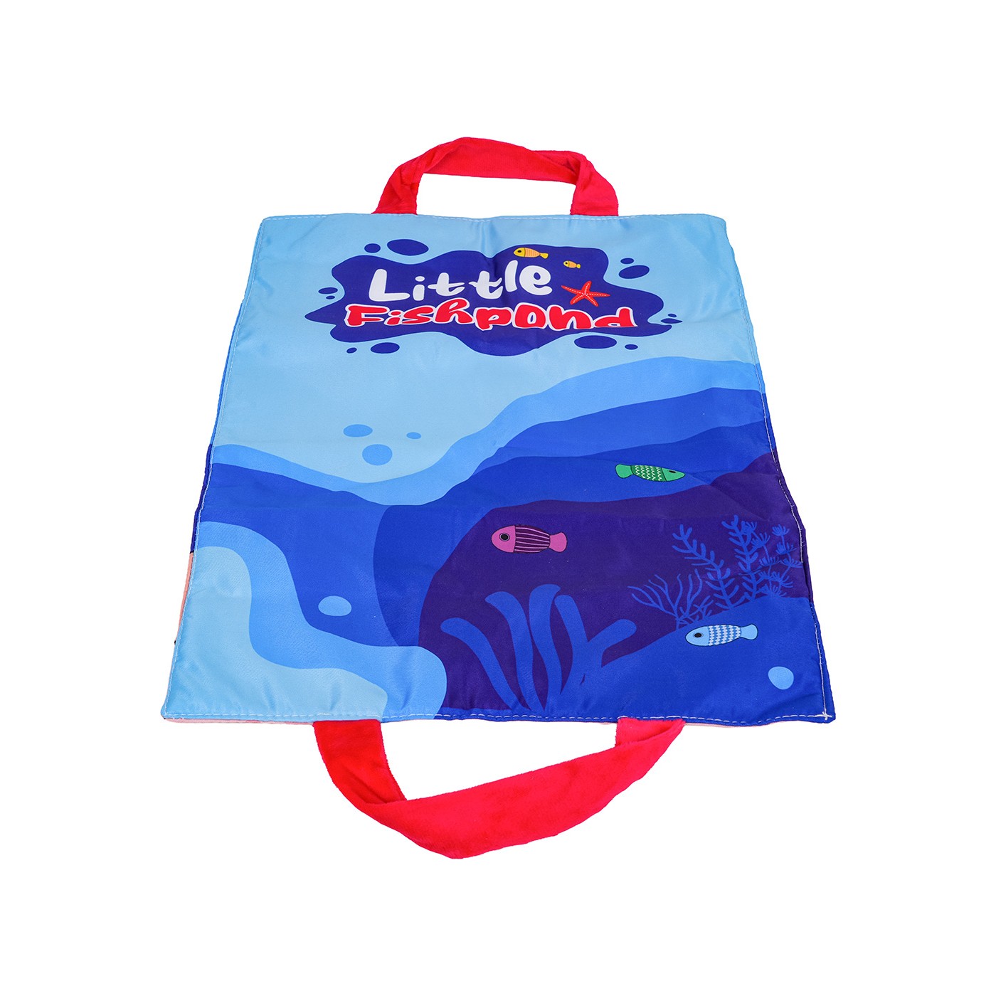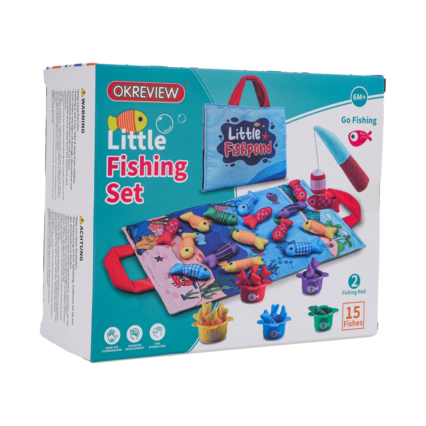 A soft, sensory fishing set for babies from six months of age. Made of child-safe materials and vibrant colors, the set stimulates children on many levels. The vibrant colors attract baby's attention and encourage grasping and playing. The set includes a fabric mat with a design depicting the sea and sea animals, 15 soft, colorful fish, 5 cups, and a Velcro fishing rod. The fish come in five colors, just like the cups. The cups are numbered from 1 to 5. Your little one must catch a fish and place it in the appropriate cup that matches the color of the fish. The number of fish in the cup should match the number on the cup. The mat has two sewn-in carrying handles, allowing you to place all the set's components inside and take them anywhere. This set helps your little one develop hand-eye coordination, stimulates vision, touch, and precision. Learns shapes, colors, matching and counting.