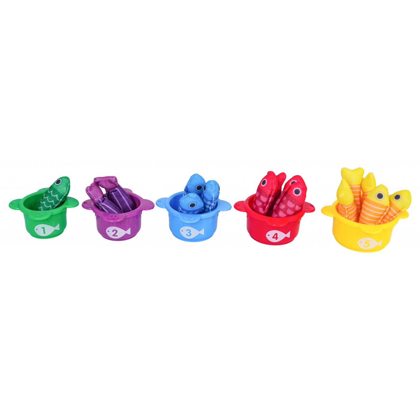 - fishing rod, - 5 yellow fish, - 4 red fish, - 3 blue fish, - 2 purple fish, - 1 green fish, - 5 cups (red, yellow, blue, green, purple), - mat with handles. |