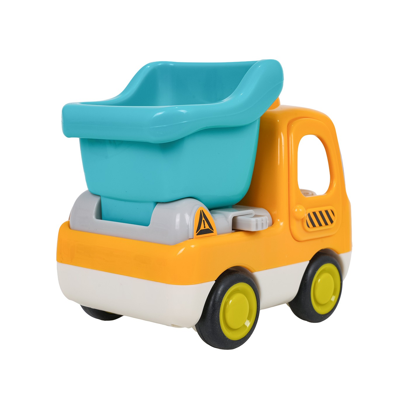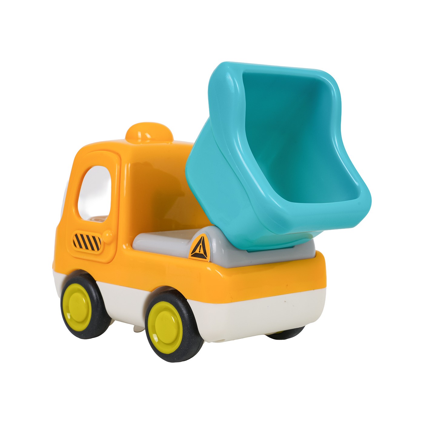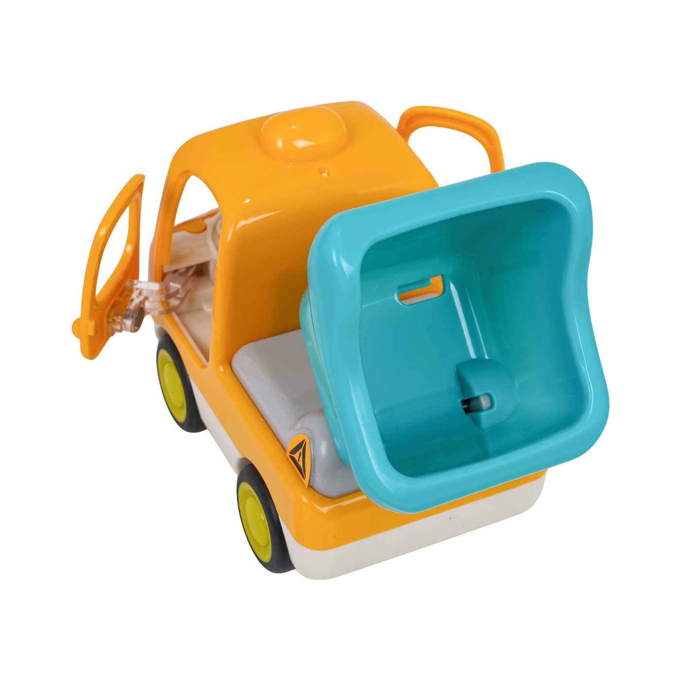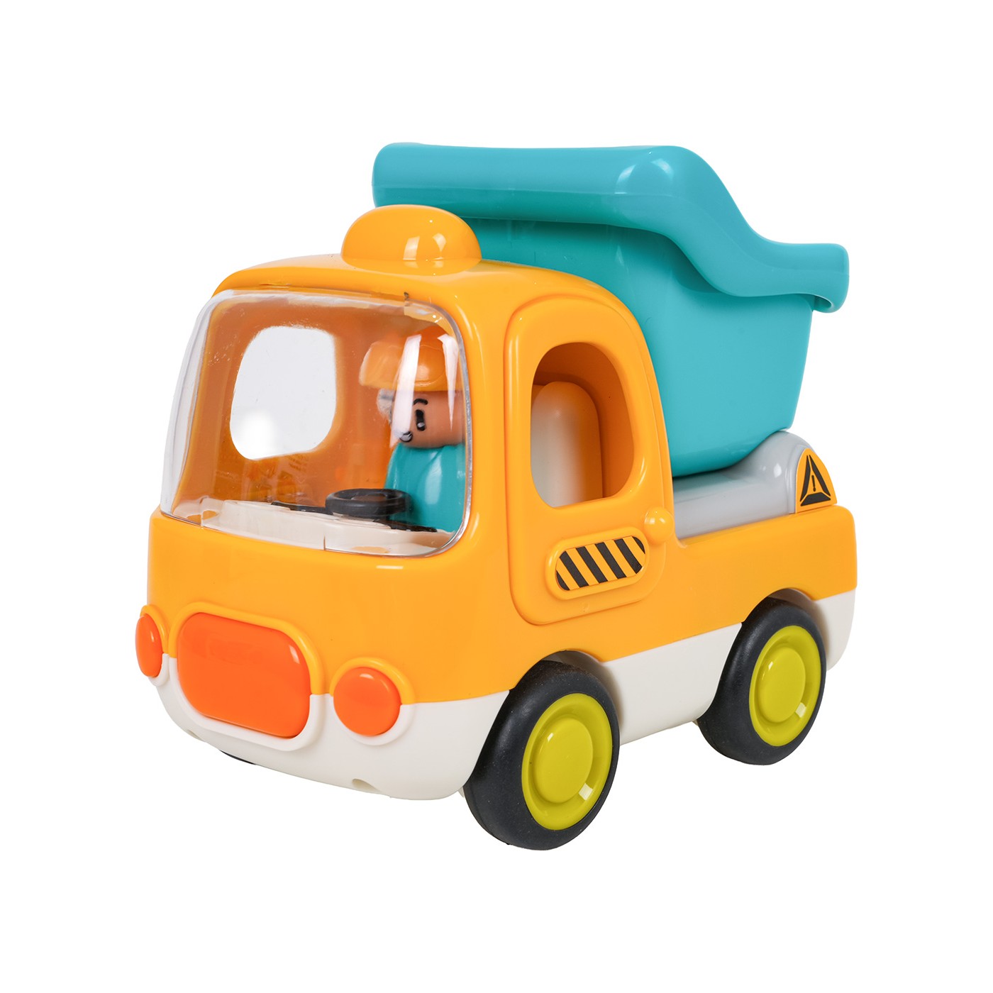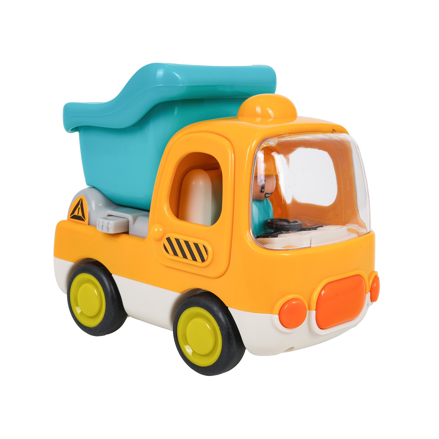 An interactive dump truck with sound and light functions for children aged ten months and up. Made of durable and safe plastic, it has no sharp edges and will withstand the most energetic play. Vibrant colors attract baby's attention and encourage play. Sound and light effects stimulate baby's senses and add realism to play. The wheels easily glide across the ground, and the vehicle's doors and trailer are movable. The toy is powered by 3 x AG13 batteries (included).