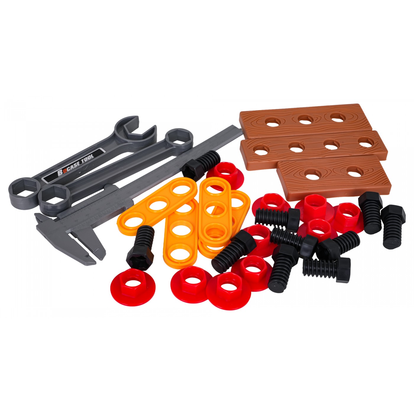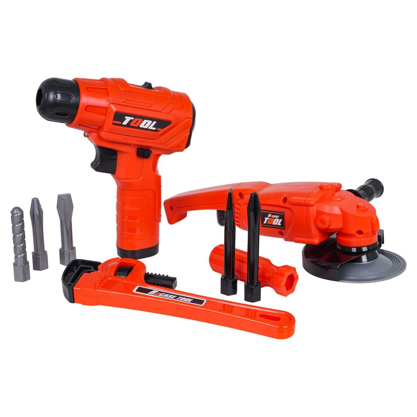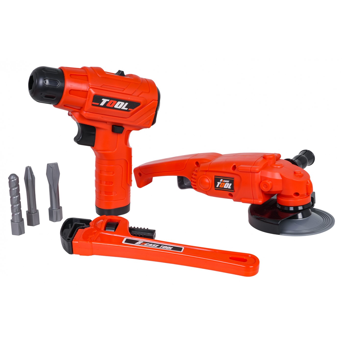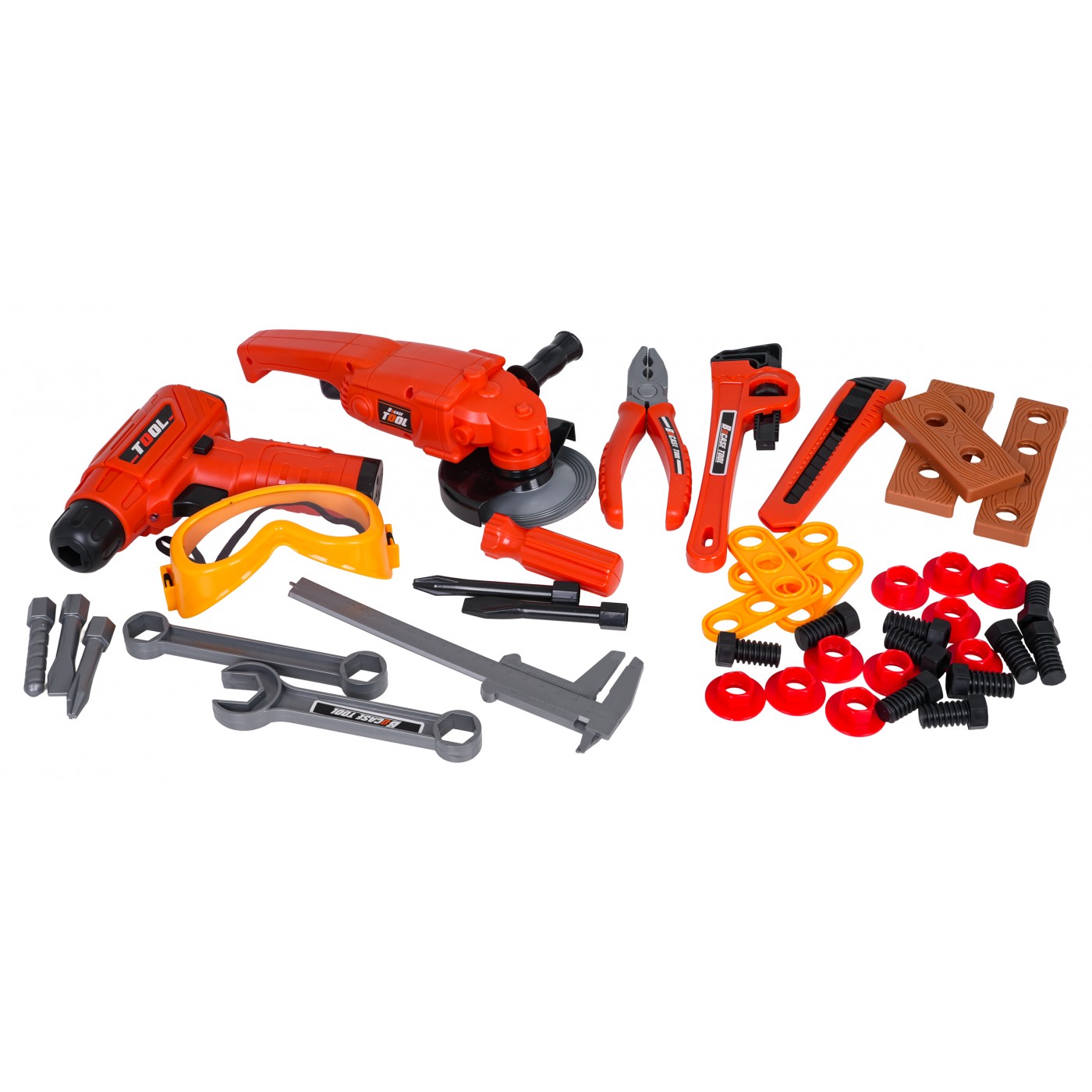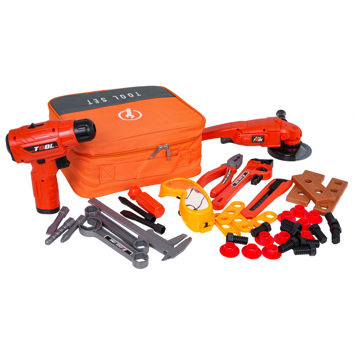 A well-equipped tool kit with a bag for children aged three and up. The set is made of high-quality plastic, with attention to detail. These toy tools are completely safe for children. The set consists of 42 pieces: a tool bag, a grinder, a drill/driver, an adjustable wrench, open-end and ring wrenches, a knife, pliers, a caliper, safety glasses, as well as screws, screwdriving tools, and replacement bits. The drill/driver is powered by 2 x AA 1.5V batteries (batteries not included). Features: - for children from three years of age, - made of the best quality materials, - attention to detail, - a convenient bag that holds all the tools, - grinder with a rotating disc (manually), - a battery-powered drill/driver with the sounds of the machine operating, screwing and unscrewing, and equipped with light effects in the form of a diode on the front. |