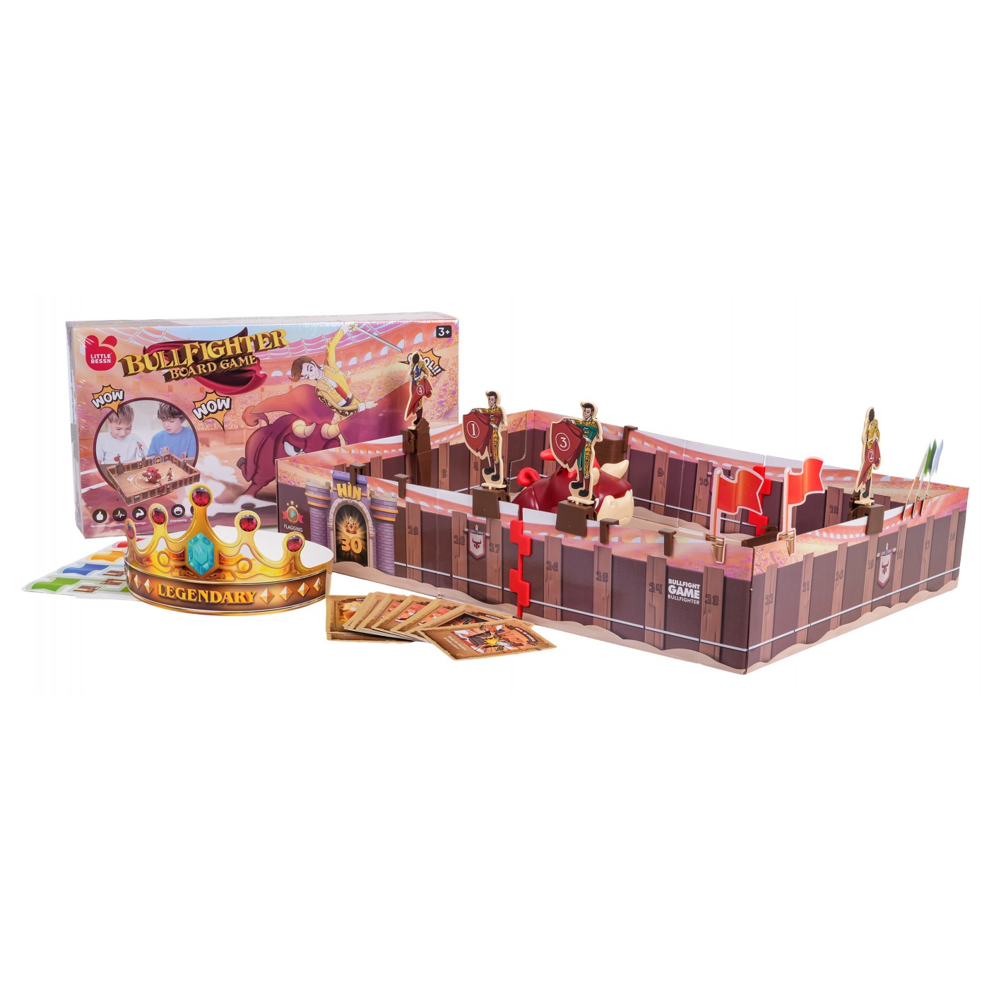 - toy bull, - crown for the winner, - 2 x cube, - 4 x toreador figure, - 4 x launcher, - 4 x safety barrier, - 16 x flag, - 14 x playing cards, - screwdriver, - pictorial instructions. |
