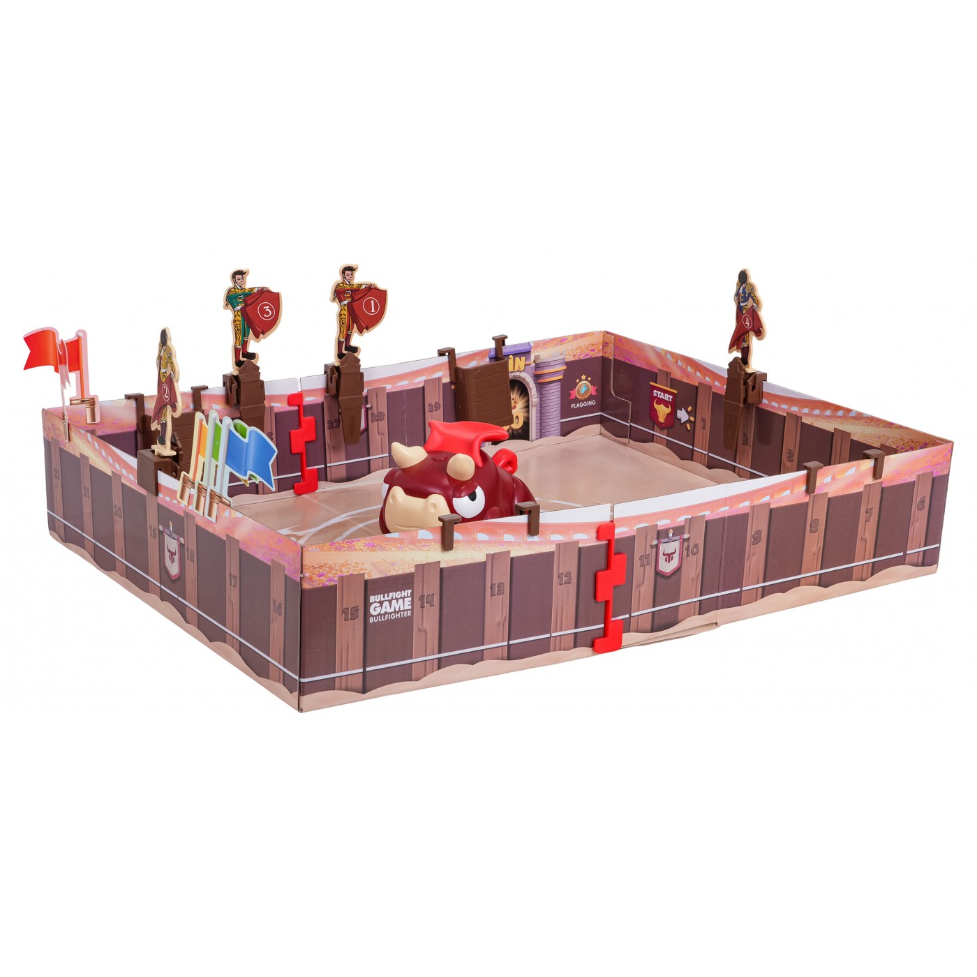- board with a bull approx. 50 cm x 37.5 cm x 9 cm, - bull approx. 13 cm x 10 cm x 9.5 cm, - toreador figurine approx. 9 cm x 4.5 cm, - safety barrier approx. 6 cm x 7 cm, - cube approx. 1.5 cm x 1.5 cm x 1.5 cm, - flag approx. 7 cm x 4.5 cm, - packaging approx. 37.5 cm x 20 cm x 9.5 cm. |