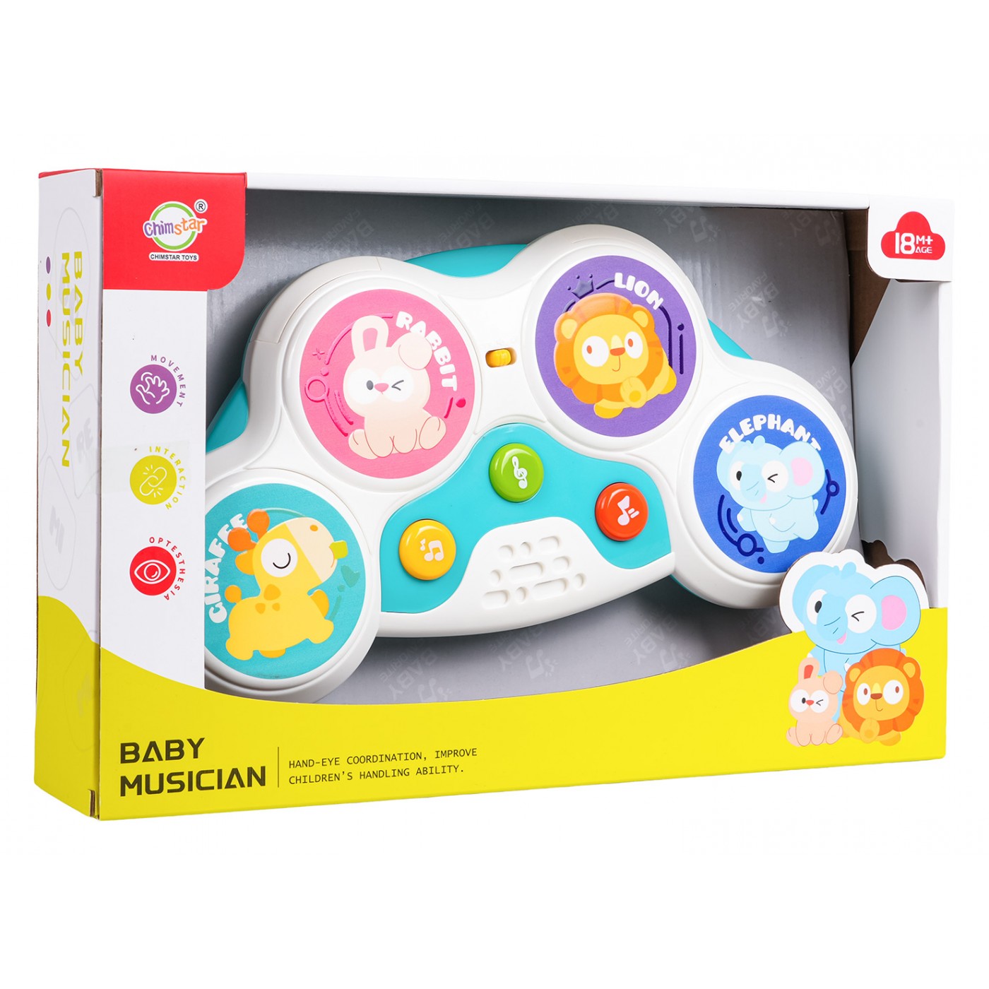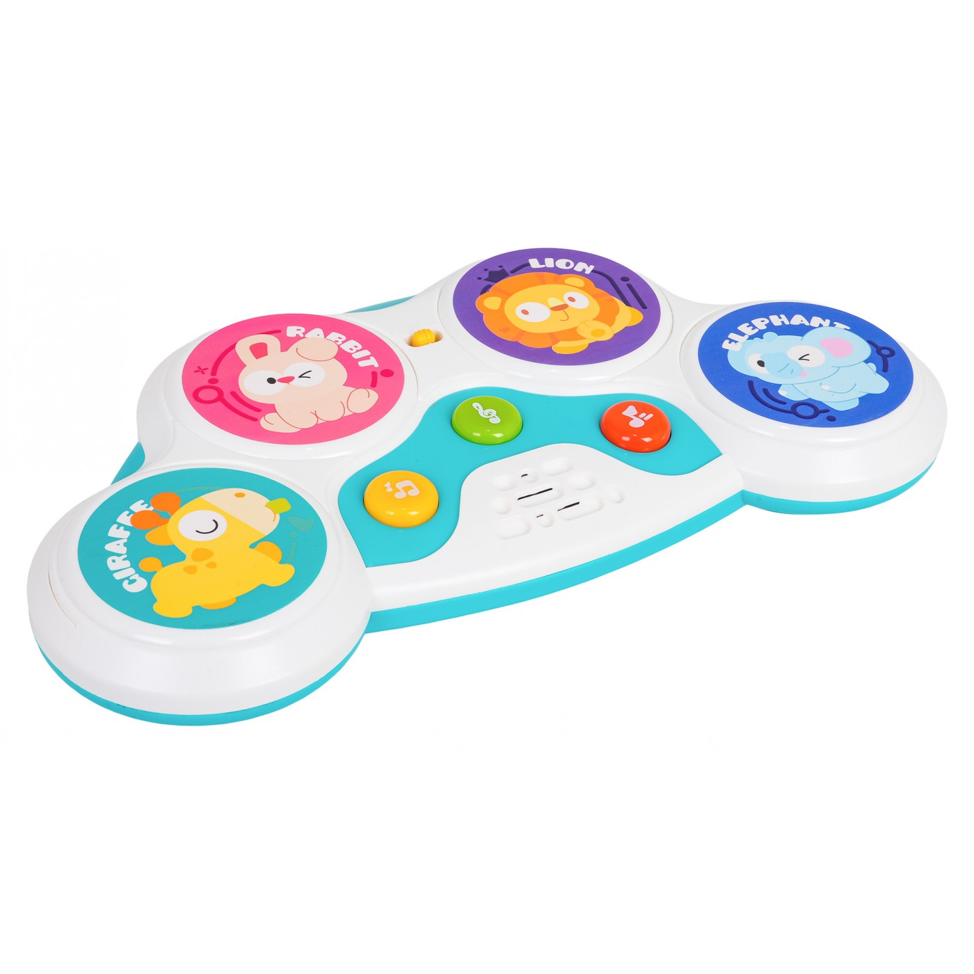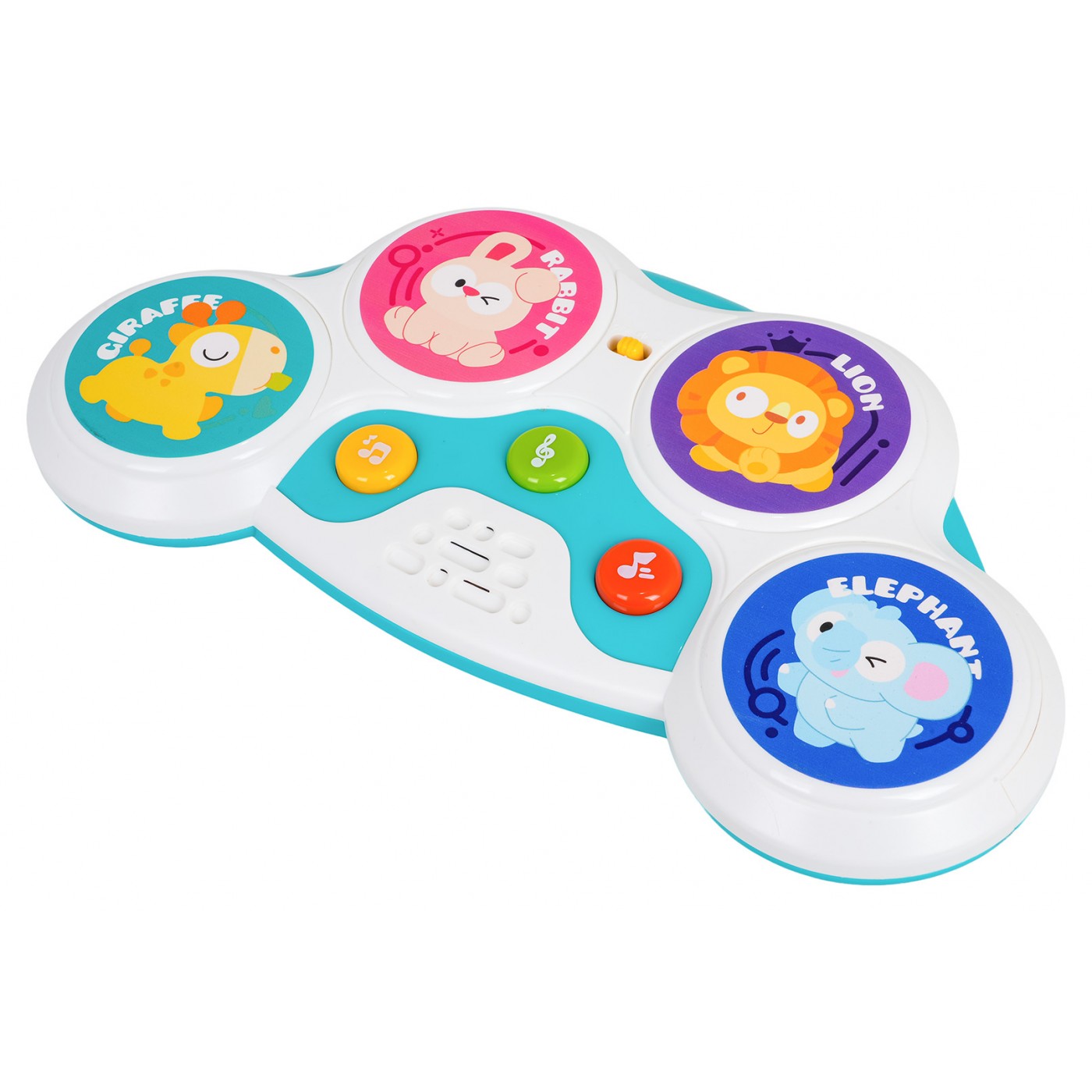 An interactive, touch-sensitive drum set for babies from eighteen months of age. Made of the highest quality materials, this toy has no sharp edges. Sound and light effects, along with a rich color palette, stimulate baby's senses on many levels. The touch-sensitive drums feature colorful images of cheerful animals: a giraffe, rabbit, lion, and elephant. Pressing them plays animal sounds, melodies, drum rhythms, and colorful lights flash along the entire length of the toy's side. The toy is powered by 3 x 1.5V AAA batteries (not included).
