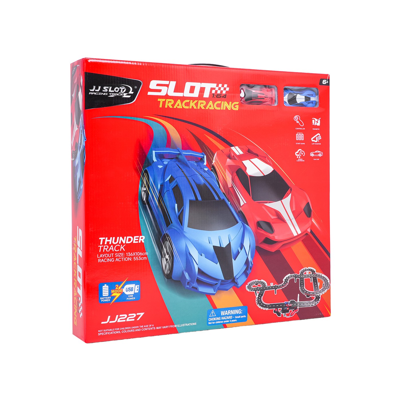 - track structural parts, - 2 vehicles, - 2 remote controls, - USB cable for power supply, - instructions. |