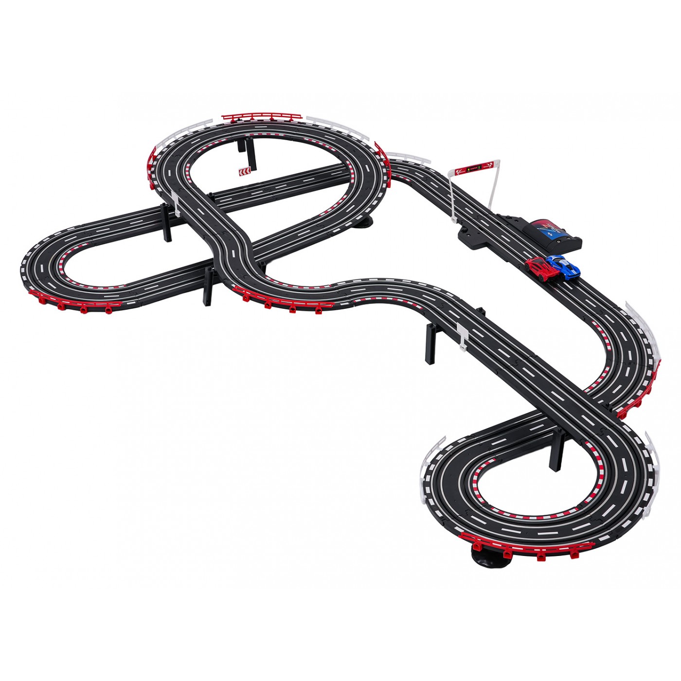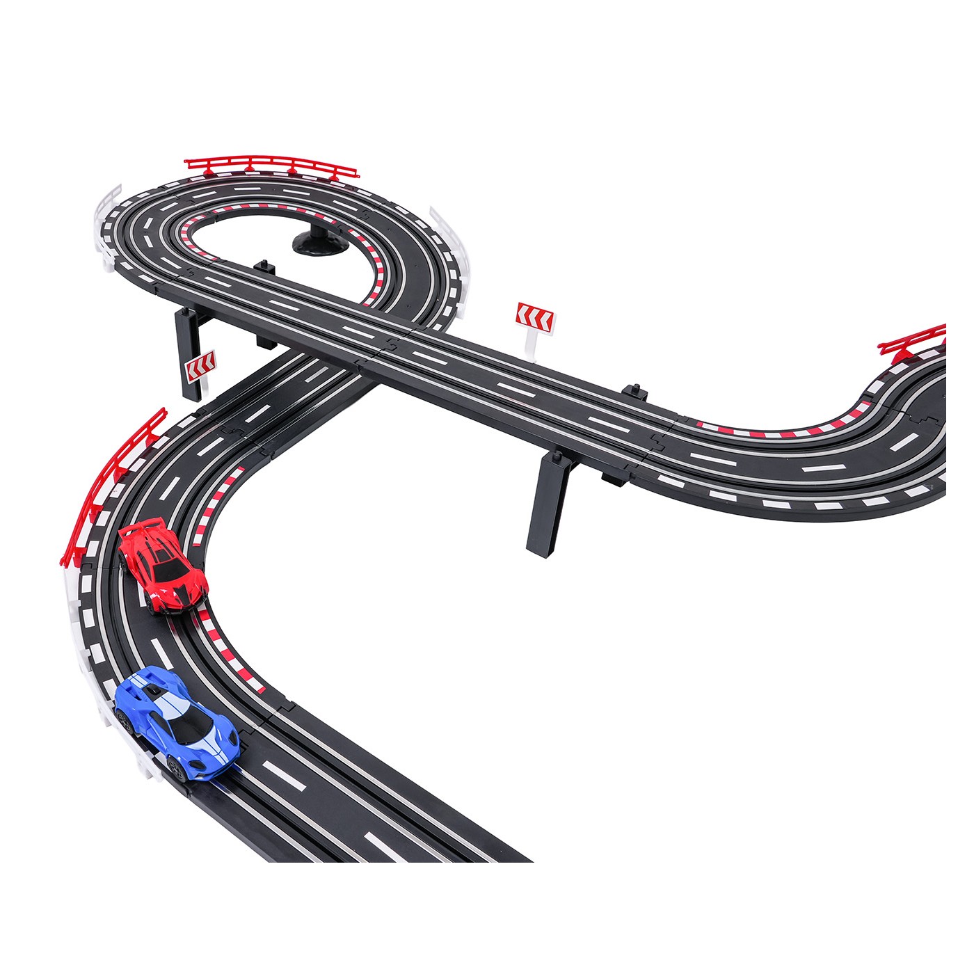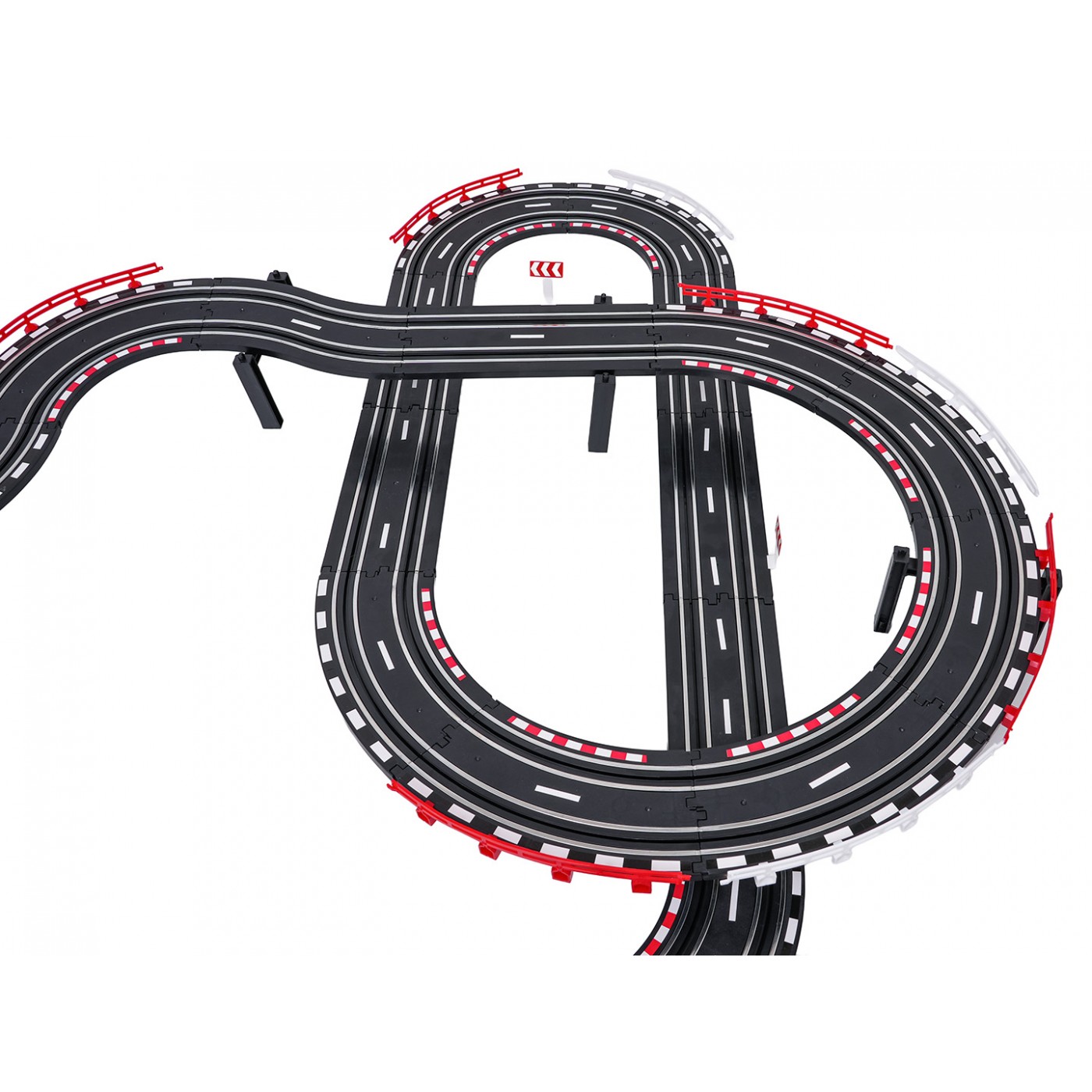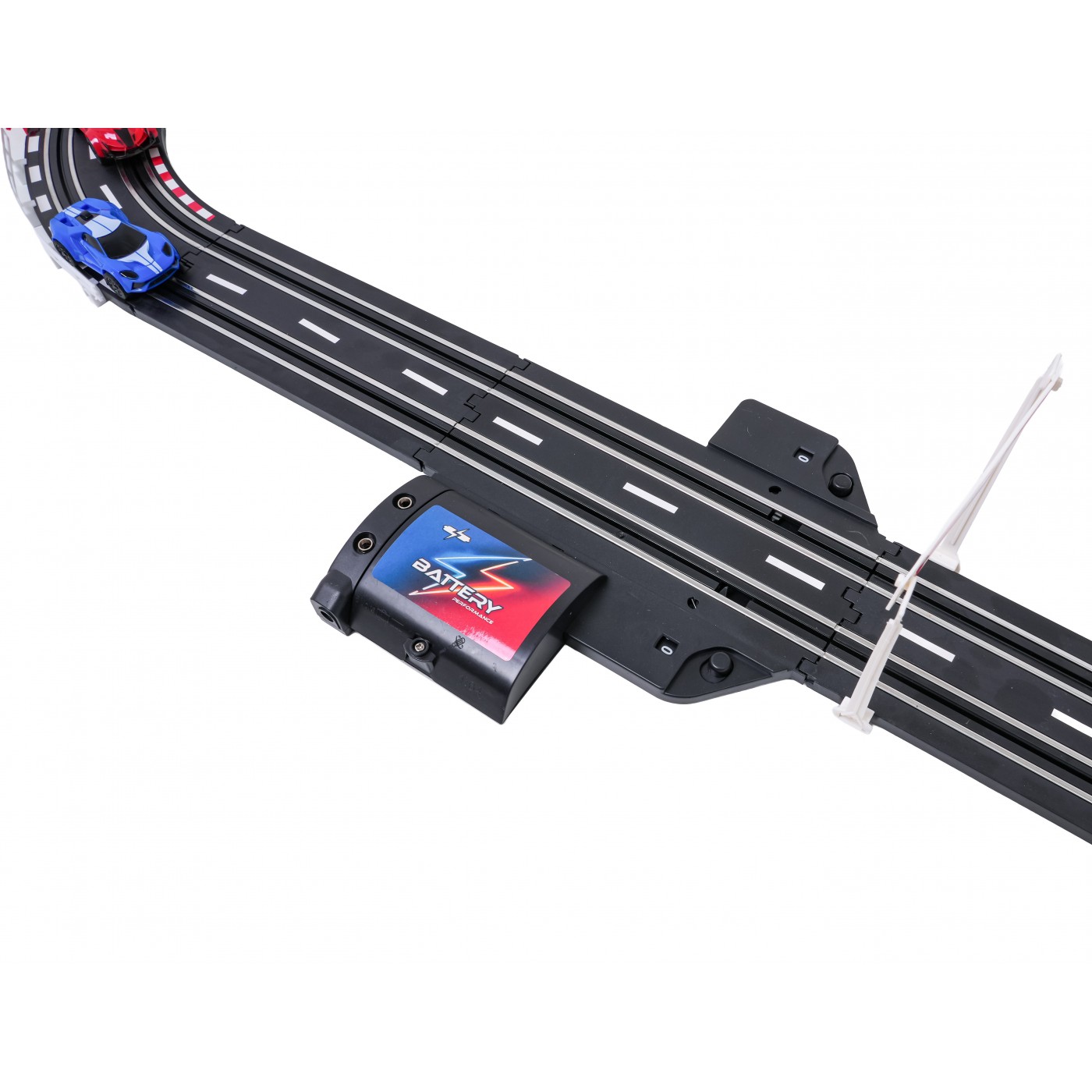 The Track Sport racing track is designed for children aged six and up. Made of the highest quality, durable materials, it can be powered by batteries or plugged into a power source. The total length of the track is 553 cm. The track has three levels and includes both straight sections and sharp turns. The sharp turns are also equipped with barriers to prevent the vehicle from falling off the track. The set includes two vehicles and two remote controls. The battery compartment holds 4 x 1.5V AA batteries (not included).