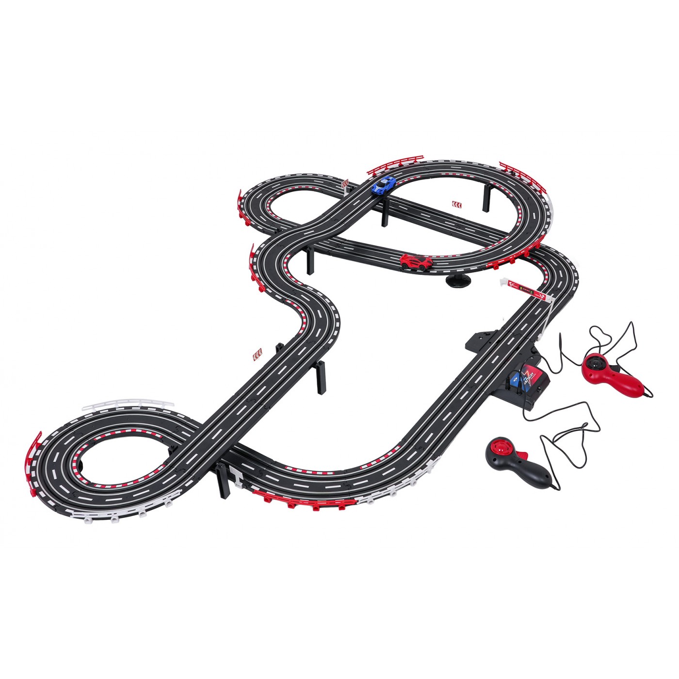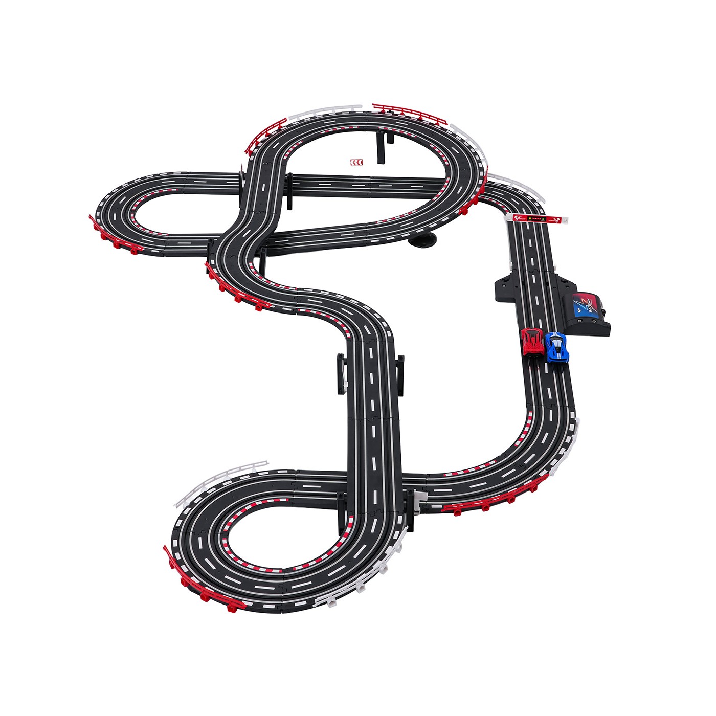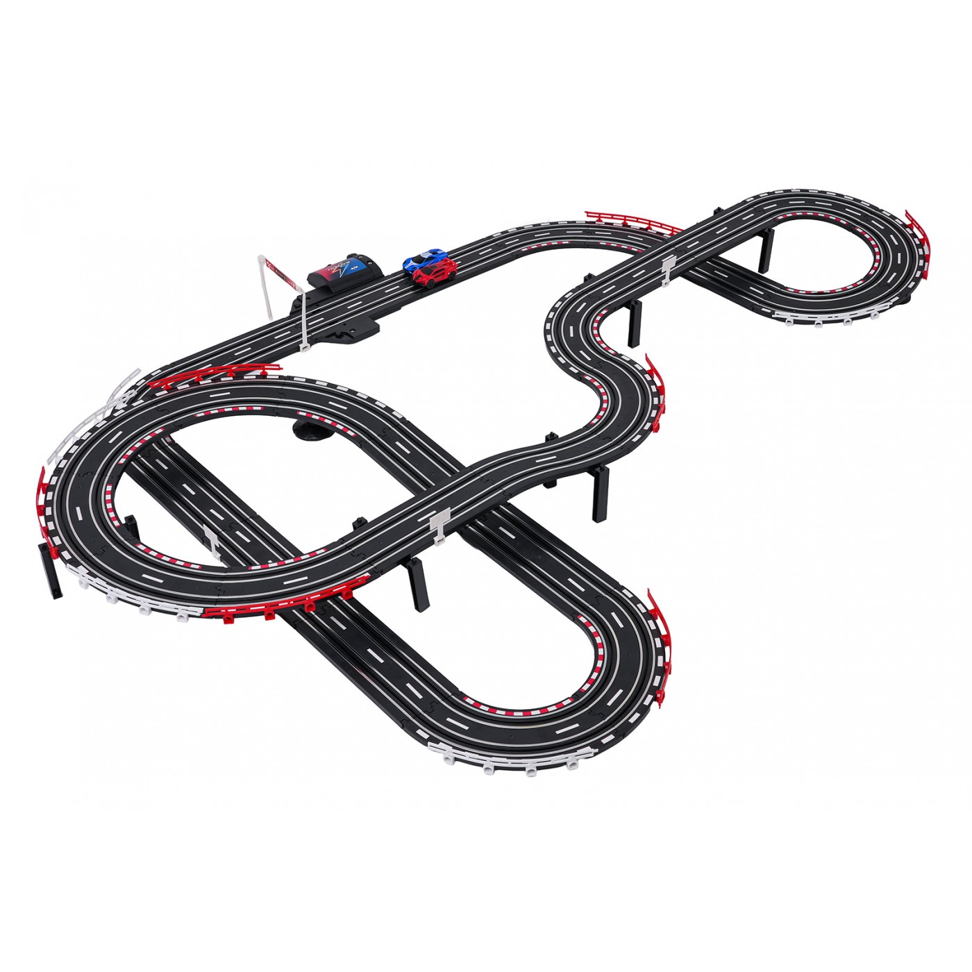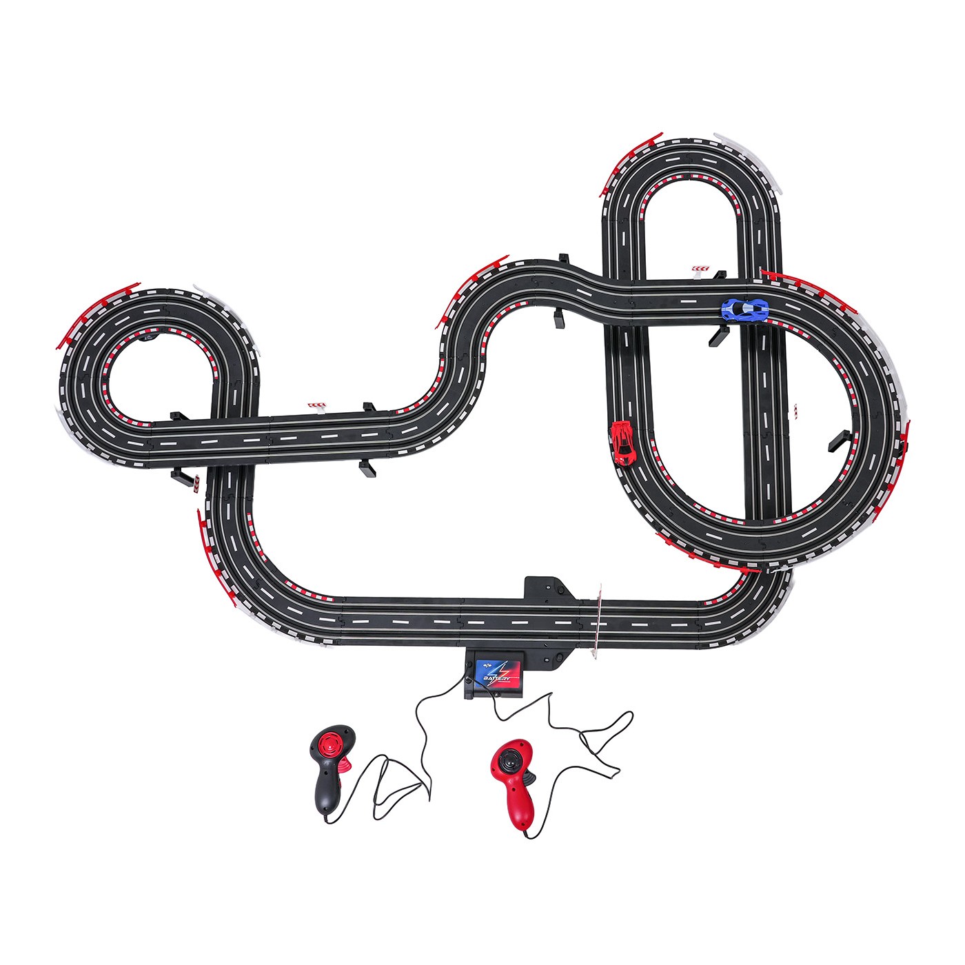 The Track Sport racing track is designed for children aged six and up. Made of the highest quality, durable materials, it can be powered by batteries or plugged into a power source. The total length of the track is 553 cm. The track has three levels and includes both straight sections and sharp turns. The sharp turns are also equipped with barriers to prevent the vehicle from falling off the track. The set includes two vehicles and two remote controls. The battery compartment holds 4 x 1.5V AA batteries (not included).