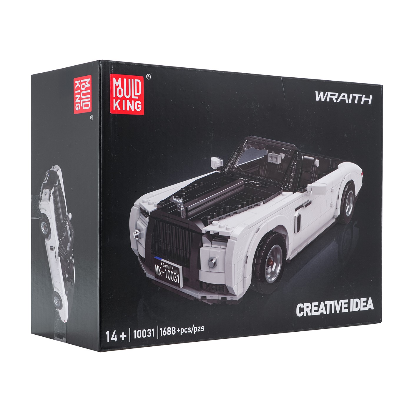 High-quality Mold King building blocks for children aged fourteen and up. This set, part of the Vehicles series, consists of 1,688 pieces that can be used to build a white convertible. This stunning model is sure to attract attention with its detailed features. The vehicle features a detailed interior, opening hood, and side doors.