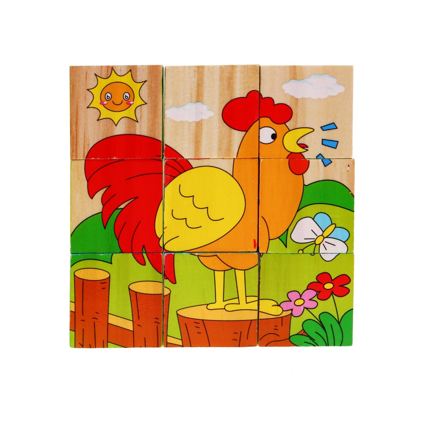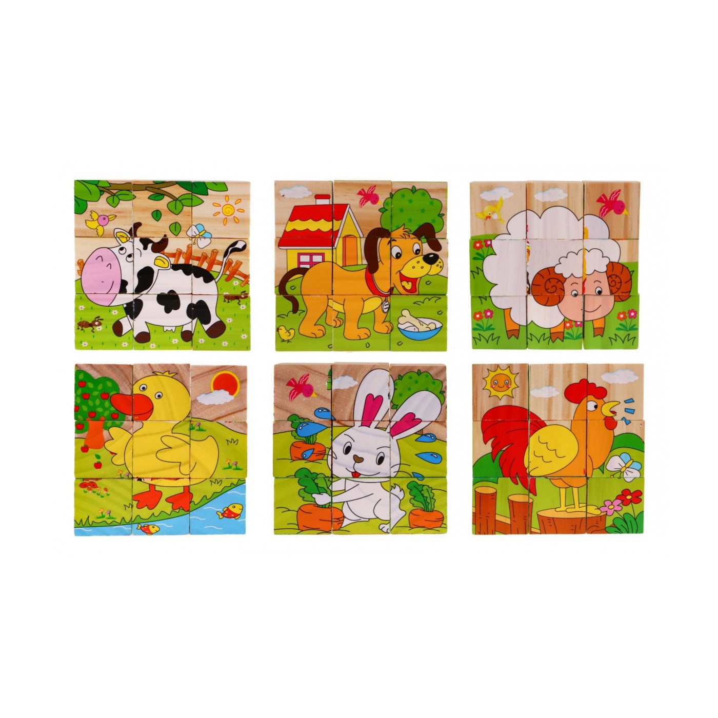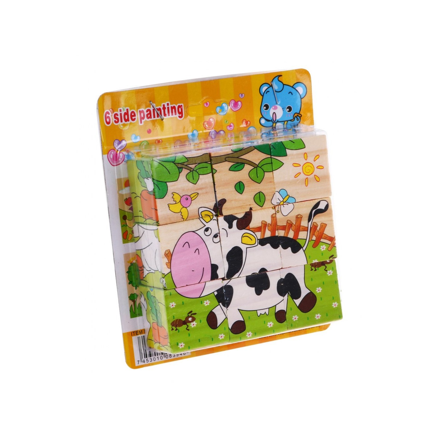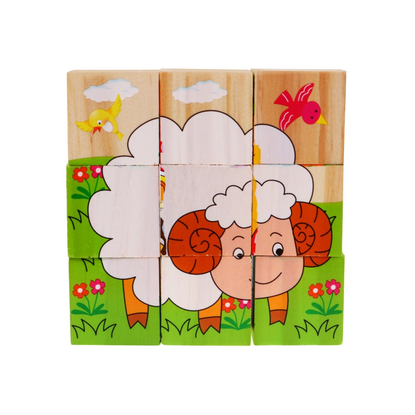Wooden blocks with pictures are suitable for children aged 18 months and up. The blocks are durable and safe for children. The set includes 9 blocks that can be used to create 6 pictures.