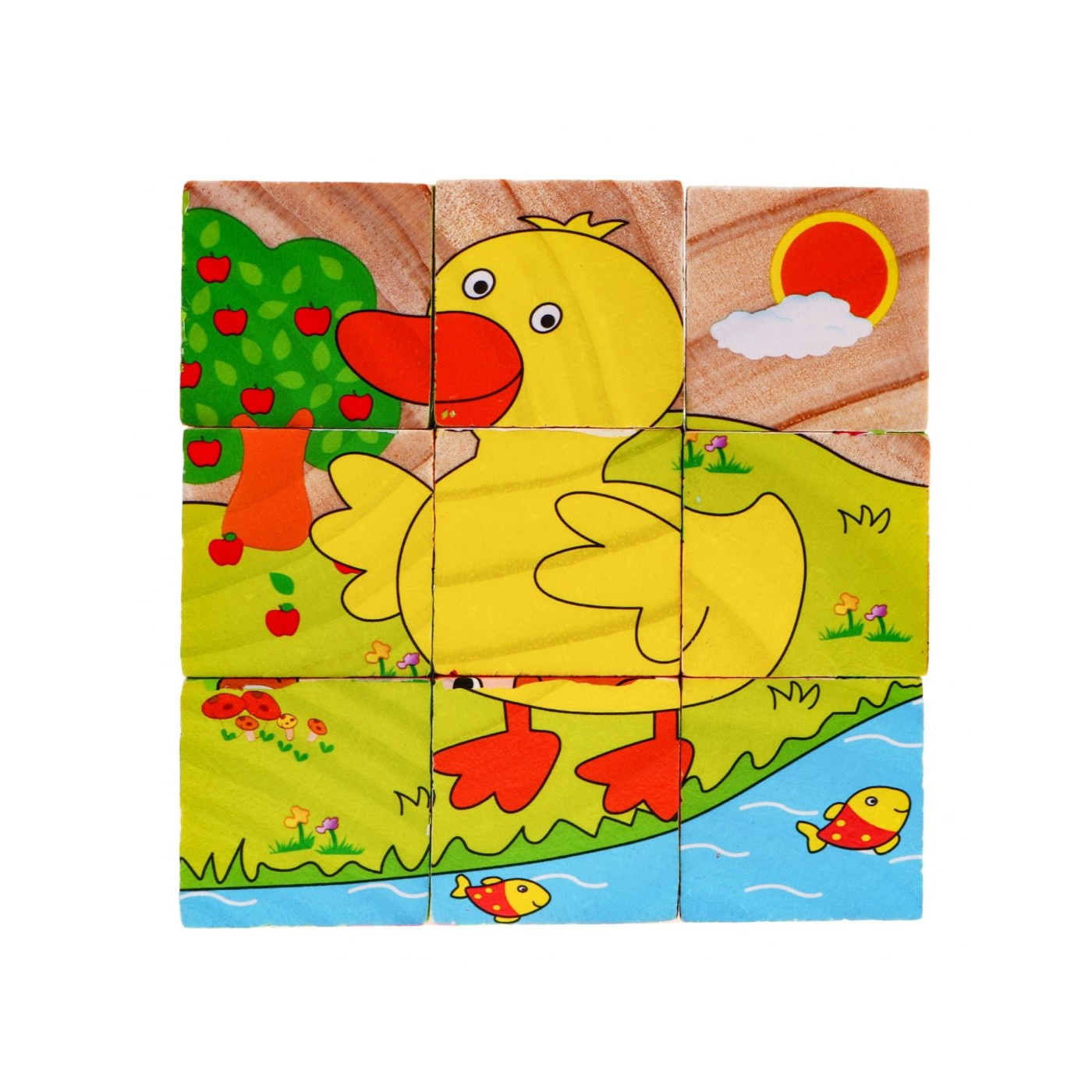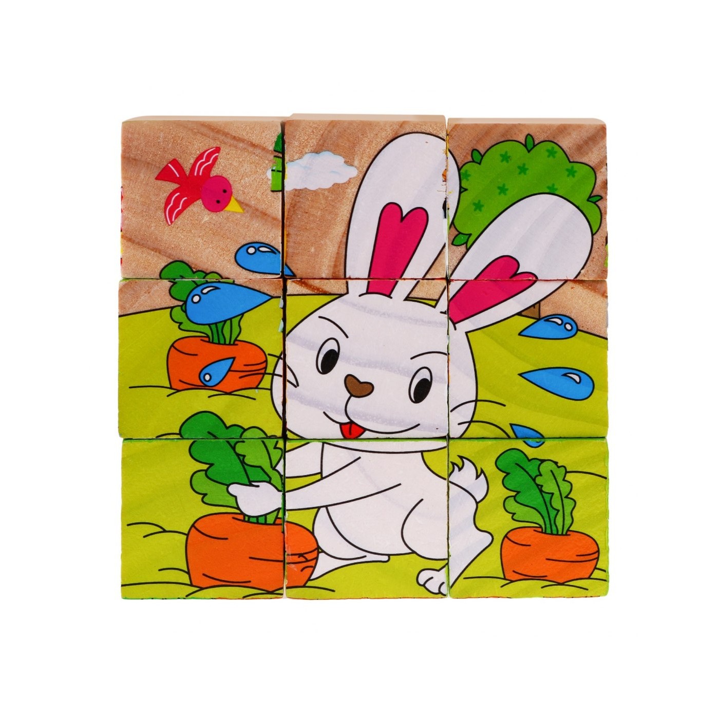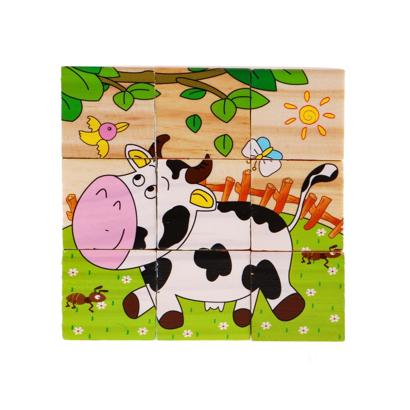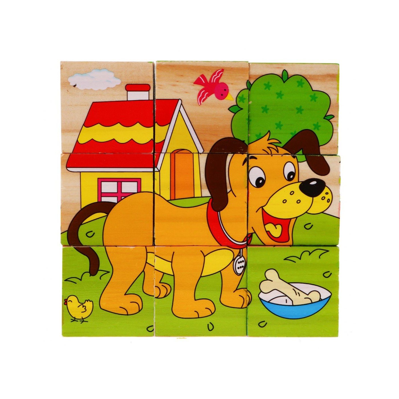 Wooden blocks with pictures are suitable for children aged 18 months and up. The blocks are durable and safe for children. The set includes 9 blocks that can be used to create 6 pictures.