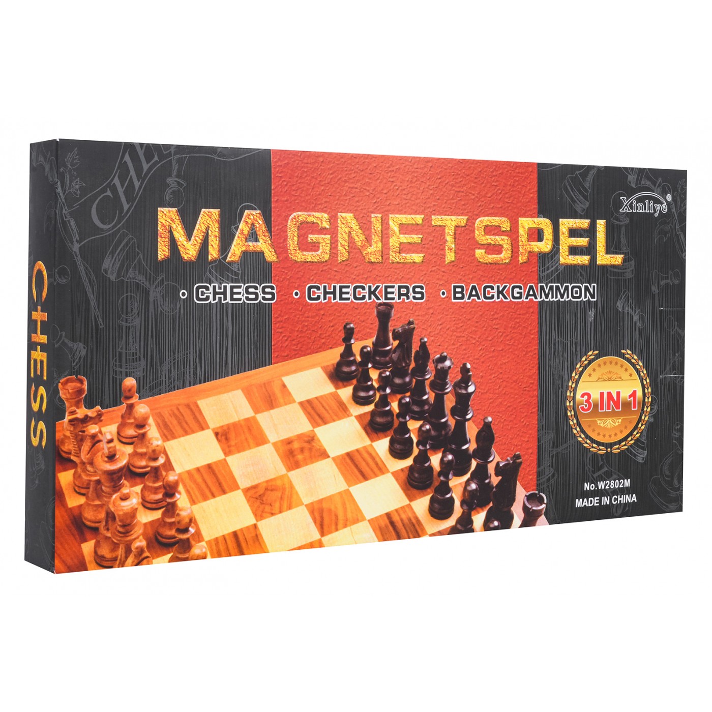 - magnetic board, - magnetic chess pieces, - checkers and backgammon pieces, - 2 cubes, - box with closure. |