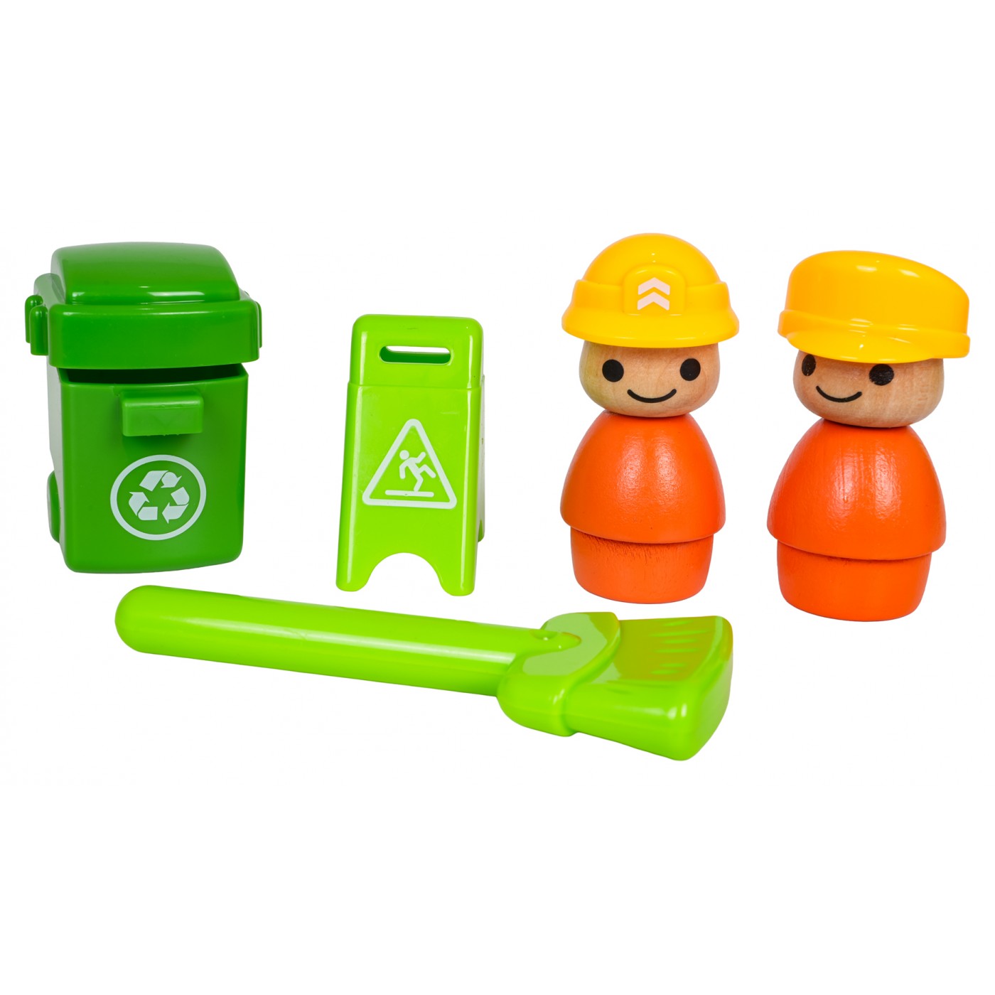 - garbage truck, - 2 figurines, - wastebasket, - warning sign, - brush. |