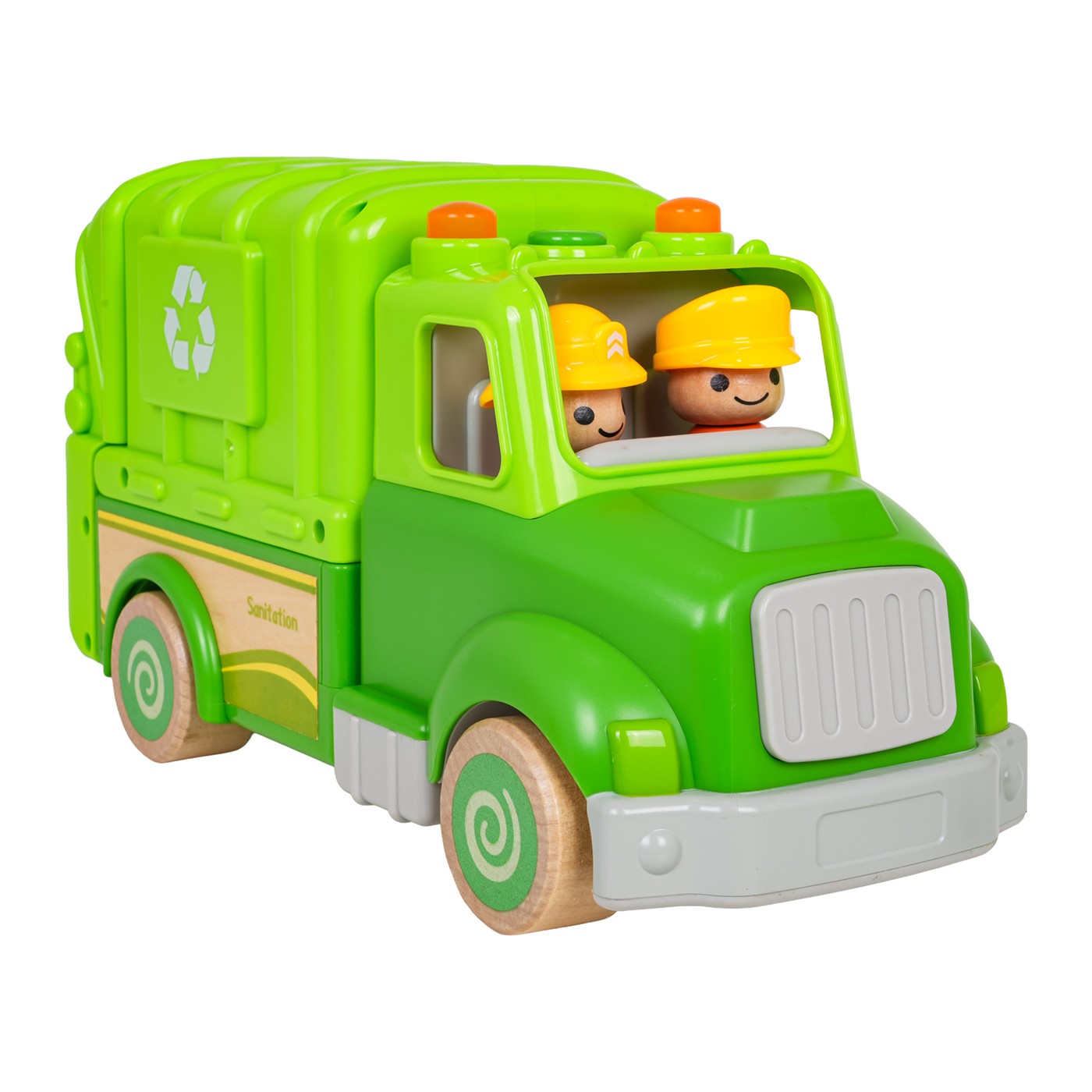 An interactive garbage truck with sound and light functions for children aged eighteen months and up. The toy is made of the highest quality materials: wood and plastic. It has no sharp edges. The garbage truck features a working garbage can lifter (crank) and an emptied function. A button on the garbage truck's roof activates melodies and flashing light effects. The set includes two figures, a garbage can, a sweeper, and a warning sign. The toy is powered by 3 x AG13 batteries (included). Features: - a toy for children from three years of age, - made of high-quality materials, plastic and wood, - movable wooden wheels, - function of lifting the garbage bin and pouring out waste (manually), - waste container that can be opened and closed and lifted up and down, - accessories included, - sound effects: melodies, vehicle start sounds, driving sounds, horn, - lighting effects: flashing lights, - hook for pulling string. |