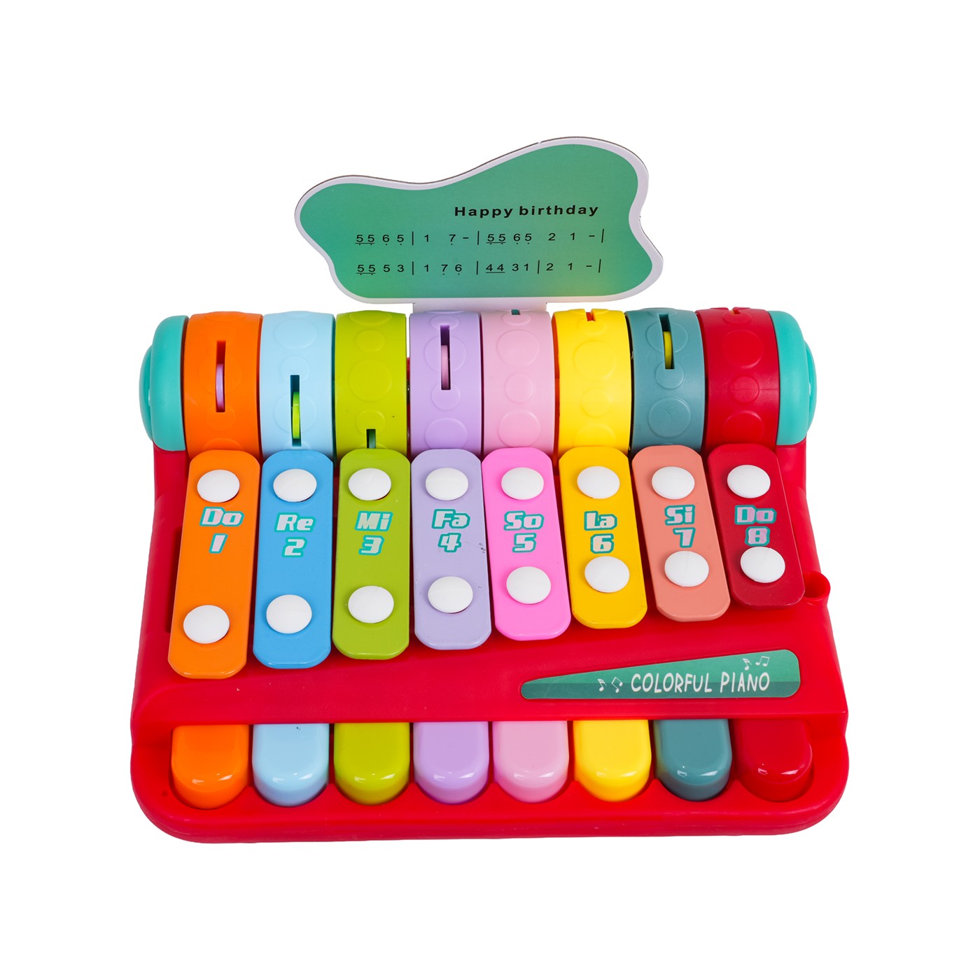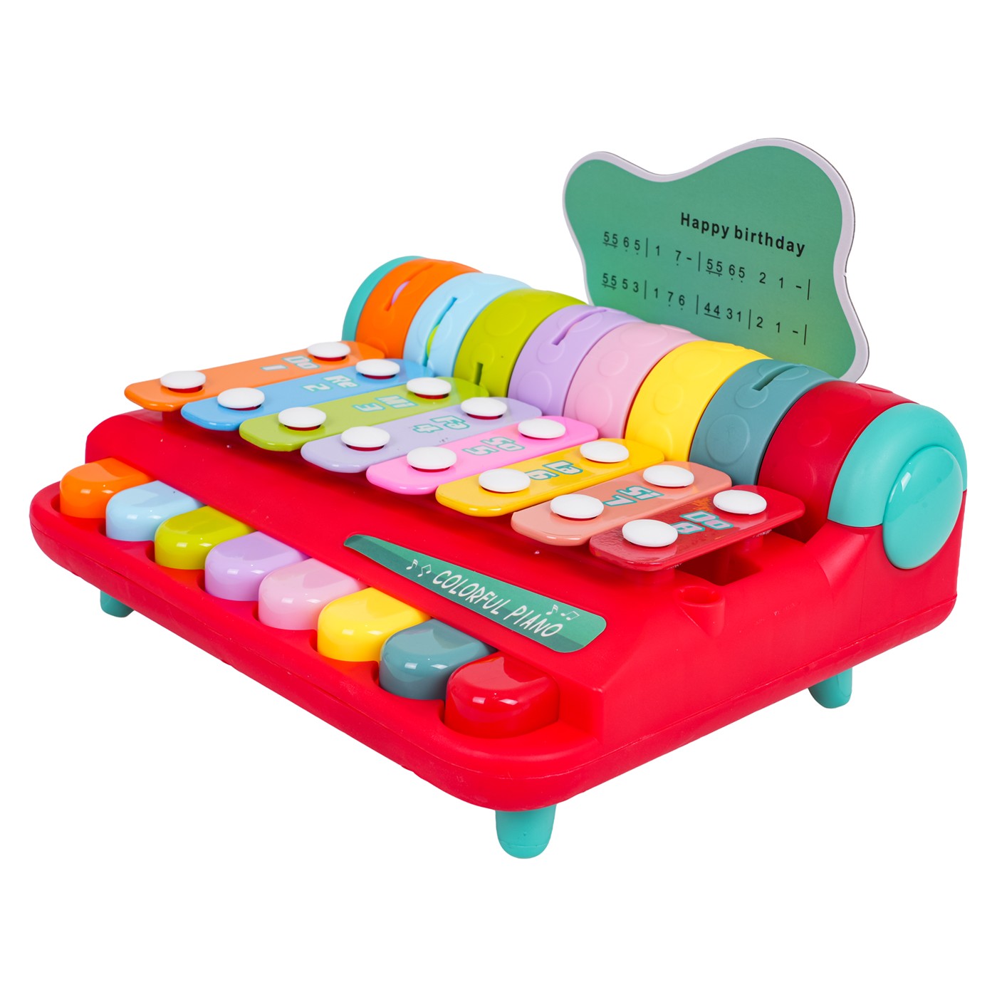 Colorful cymbals for toddlers aged eighteen months and up. This toy instrument is made of the highest quality materials in vibrant colors. Toddlers can press the keys, strike the metal plates with the hammer, or rotate the rings to produce sound. The set also includes sheet music for popular English songs.